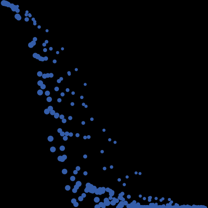 turtles-own [ mass velocity-x ; particle velocity in the x axis velocity-y ; particle velocity in the y axis force-accumulator-x ; force exerted in the x axis force-accumulator-y ; force exerted in the y axis ] to setup clear-all set-default-shape turtles "circle" reset-ticks end to go create-particles compute-forces ; calculate the forces and add them to the accumulator apply-forces ; calculate the new location and speed by multiplying the ; forces by the step-size tick-advance step-size display end to create-particles ;; using a Poisson distribution keeps the rate of particle emission ;; the same regardless of the step size let n random-poisson (rate * step-size) if n + count turtles > max-number-of-particles [ set n max-number-of-particles - count turtles ] ask patch min-pxcor max-pycor [ sprout n [ set color blue set size 0.5 + random-float 0.5 set mass 5 * size ^ 2 ; mass proportional to square of size setxy min-pxcor max-pycor set velocity-x initial-velocity-x - random-float initial-range-x + random-float initial-range-x set velocity-y initial-velocity-y ] ] end to compute-forces ask turtles [ ; clear the force-accumulator set force-accumulator-x 0 set force-accumulator-y 0 ; calculate the forces apply-gravity apply-wind apply-viscosity ] end to apply-gravity ;; turtle procedure ; scale the force of the gravity according to the particle's mass; this ; simulates the effect of air resistance set force-accumulator-y force-accumulator-y - gravity-constant * mass end to apply-wind ;; turtle procedure set force-accumulator-x force-accumulator-x + wind-constant-x set force-accumulator-y force-accumulator-y + wind-constant-y end to apply-viscosity ;; turtle procedure set force-accumulator-x force-accumulator-x - viscosity-constant * velocity-x set force-accumulator-y force-accumulator-y - viscosity-constant * velocity-y end ; calculates the position of the particle at each step but bounces if the particle ; reaches the edge to apply-forces ask turtles [ ; calculate the new velocity of the particle set velocity-x velocity-x + ( force-accumulator-x * step-size) set velocity-y velocity-y + ( force-accumulator-y * step-size) ; calculate the displacement of the particle let step-x velocity-x * step-size let step-y velocity-y * step-size let new-x xcor + step-x let new-y ycor + step-y if patch-at step-x step-y = nobody [ ; if the particle touches a wall or the ceiling, it dies if new-x > max-pxcor or new-x < min-pxcor or new-y > max-pycor [ die ] ; if the particle touches the floor, bounce with floor-damping set velocity-y (- velocity-y * restitution-coefficient) set step-y velocity-y * step-size set new-y ycor + step-y ] facexy new-x new-y setxy new-x new-y ] end ; Copyright 2007 Uri Wilensky. ; See Info tab for full copyright and license.