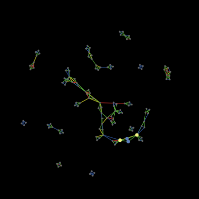 You can also see the different emergent topologies in the display. New collaborations or synergy among teams naturally tend to the center of the display. Teams or clusters of teams with few connections to new collaborations naturally "float" to the edges of the world. Newcomers always start in the center of the world. Incumbents, which are chosen at random, may be located in any part of the screen. Thus, collaborations amongst newcomers and or distant team components tend toward the center, and disconnected clusters are repelled from the centered.