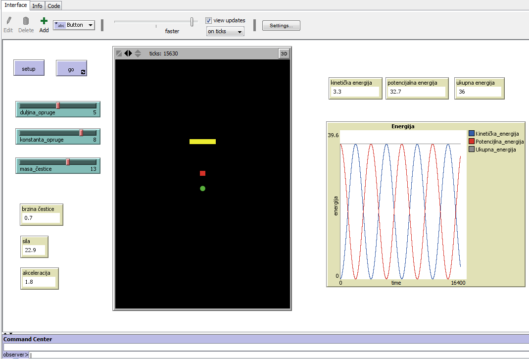 Pomou klizaa 'duljinaopruge' odreujemo ravnoteni poloaj estice. Pomou klizaa 'konstantaopruge' odreujemo konstantu opruge. Pomou klizaa 'masaestice' odreujemo masu estice koja titra. Pritiskom na tipku 'setup' stvorit _e se _estica oblika kruga, oslonac na kojem je uvrena opruga i jedan kvadrati_ (patch) koji oznaava donji dio opruge. Pritiskom na tipku 'go' simulacija se pokree i estica poinje titrati. (Napomena: Jednostavnosti radi, sama opruga nije vidljiva na simulaciji ve_ je moramo zamisliti. Uz pomo_ patch-eva prikazan je oslonac na koji je u_vren gornji dio opruge, dok je donji dio prikazan kao jedan crveni patch)
