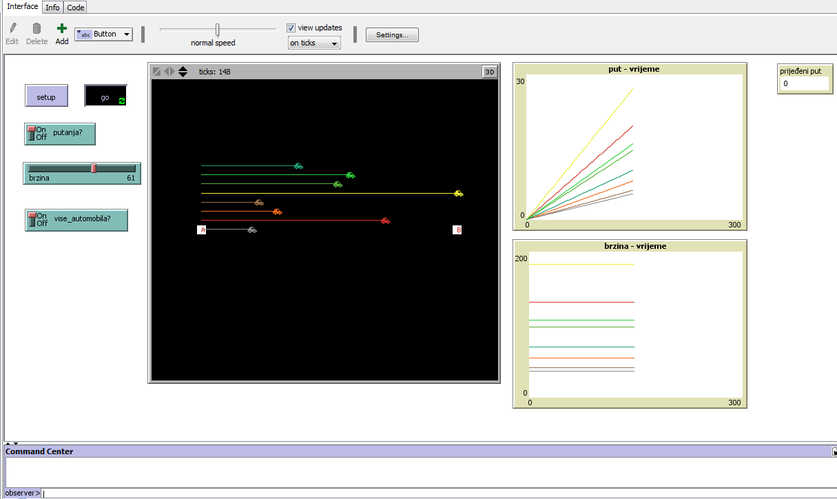Pomou prekidaa 'viseautomobila?' biramo da li _emo promatrati jednoliko pravocrtno gibanje jednog ili vie automobila. U sluaju jednog automobila, pomou klizaa 'brzina' postavljamo iznos brzine kojom _e se automobil gibati, a u sluaju vie automobila brzina pojedinog automobila je nasumino odabrana i moe se promatrati na brzina - vrijeme grafu. Pritiskom na gumb 'setup' prikazat _e se automobil/automobili kao i polazna (A) i krajnja (B) toka gibanja. Namjestimo li prekida_ 'putanja?' na On, putanja gibanja automobila je vidljiva, inae se ne vidi. Pritiskom na gumb 'go' simulacija se pokree, odnosno automobil/automobili se po_inju gibati konstantnom brzinom.
