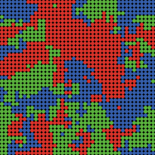 breed [ rocks ] breed [ papers ] breed [ scissors ] to setup clear-all set-default-shape rocks "circle-rock" set-default-shape papers "circle-paper" set-default-shape scissors "circle-scissor" ask patches [ sprout 1 [ set breed (one-of (list rocks papers scissors)) ] ] reset-ticks end to go ask turtles [ play ] tick set-plot-x-range ticks - 300 ticks end to play let opponent (one-of turtles-on neighbors4) let opponent-breed ([breed] of opponent) if (breed = opponent-breed) [ stop ] ifelse ((breed = rocks and opponent-breed = scissors) or (breed = papers and opponent-breed = rocks) or (breed = scissors and opponent-breed = papers)) [ ask opponent [ set breed ([breed] of myself) ] ] [ set breed opponent-breed ] end