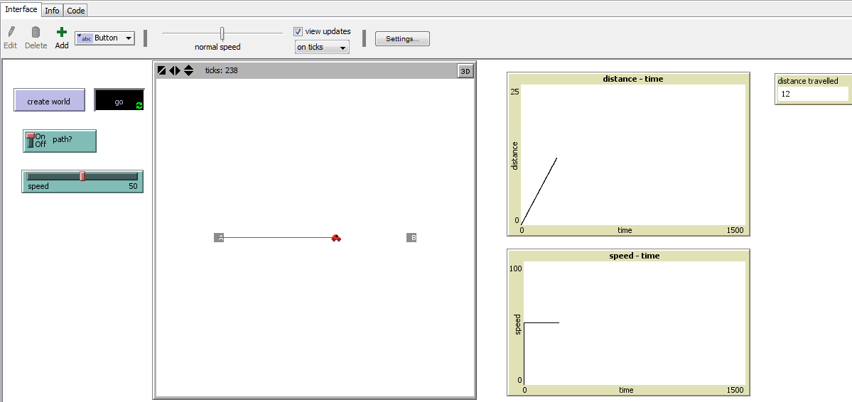 Pomoću klizača 'brzina' postavljamo iznos brzine kojom će se automobil gibati. Pritiskom na gumb 'setup' prikazat će se automobil kao i polazna (A) i krajnja (B) točka gibanja. Namjestimo li prekidač 'putanja?' na On, putanja gibanja automobila je vidljiva, inače se ne vidi. Pritiskom na gumb 'go' simulacija se pokreće, odnosno automobil se počinje gibati konstantnom brzinom.