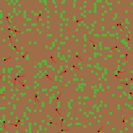 The second variation includes grass (green) in addition to wolves and sheep. The behavior of the wolves is identical to the first variation, however this time the sheep must eat grass in order to maintain their energy - when they run out of energy they die. Once grass is eaten it will only regrow after a fixed amount of time. This variation is more complex than the first, but it is generally stable.