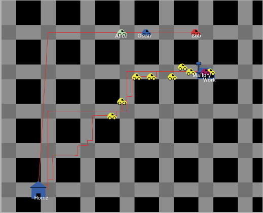 ;;; Include files for communication and BDI agents __includes ["communication.nls" "bdi.nls" "coordinates.nls" "UserAgent.nls"] globals [passengers-left passengers-on-taxis passengers-arrived crashed current-light num-cars-stopped roads intersections list-distance list-path-waypoint list-distance-path list-dist-path list-links list-all-path list-total-distance waypoint-count number-waypoint list-waypoints strating-point path previous-waypoint total-distance final-distance fp] breed [houses house] breed [ works work] breed [people-arrived person-arrived] patches-own [distance-work road street-name is-intersection? ] ;;;;;;;;;;;;;;;;;;;;;;;;;;;;;;;;;;;;;;;;;;;;;;;;;;;;;;;;;;;;;;;;;;;;;;;;;;;;;;;;;;;;;;;;;;;;;;;;;;;; ;;; Setting up the Experiment ;;;;;;;;;;;;;;;;;;;;;;;;;;;;;;;;;;;;;;;;;;;;;;;;;;;;;;;;;;;;;;;;;;;;;;;;;;;;;;;;;;;;;;;;;;;;;;;;;;;; to setup clear-all set current-light nobody set num-cars-stopped 0 set number cars-number + 2 set count-down 10 ;set n 2 set crashed 0 ask patches [ set road 0 set distance-work -1] setup-streets setup-cars setup-work label-patches reset-ticks end to setup-streets let px min-pxcor while [px <= max-pxcor] [ ask patches with [pxcor = px or pxcor = px + 1 or pxcor = px + 2] [set pcolor grey set road road + 1] ask patches with [pycor = px or pycor = px + 1 or pycor = px + 2] [set pcolor grey set road road + 1] ask patches with [road = 2] [set pcolor 4 set is-intersection? true set intersections intersections + 1] set px px + 8 ] end to setup-work create-works 1 [ set shape "building store" set Label "Work" set size 4 set heading 0 set color Blue setxy 15 7 ask patches with [distance myself = 0] [set pcolor green set distance-work 0 ] ] create-works 1 [ set shape "house" set Label "Home" set size 4 set heading 0 set color Blue setxy -19 -17 ] end to label-patches while [any? patches with [distance-work < 0 and road > 0] ] [setup-distances-work] end to setup-distances-work let labeled-patches patches with [distance-work >= 0] ask labeled-patches [ let dis distance-work ask neighbors4 with [distance-work < 0 and road > 0] [set distance-work dis + 1] ] end ;;;;;;;;;;;;;;;;;;;;;;;;;;;;;;;;;;;;;;;;;;;;;;;;;;;;;;;;;;;;;;;;;;;;;;;;;;;;;;;;;;;;;;;;;;;;;;;;;;;; ;;; Running the Experiment ;;;;;;;;;;;;;;;;;;;;;;;;;;;;;;;;;;;;;;;;;;;;;;;;;;;;;;;;;;;;;;;;;;;;;;;;;;;;;;;;;;;;;;;;;;;;;;;;;;;; to go ask cars [car-behaviour] tick end ;;; Place the turtle somewhere where there is noboby else and there is a road. to rand-xy-co-on-road let x 0 let y 0 loop [ set x random-pxcor set y random-pycor if not any? turtles-on patch-at x y and [road > 0] of patch-at x y [setxy x y stop] ] end