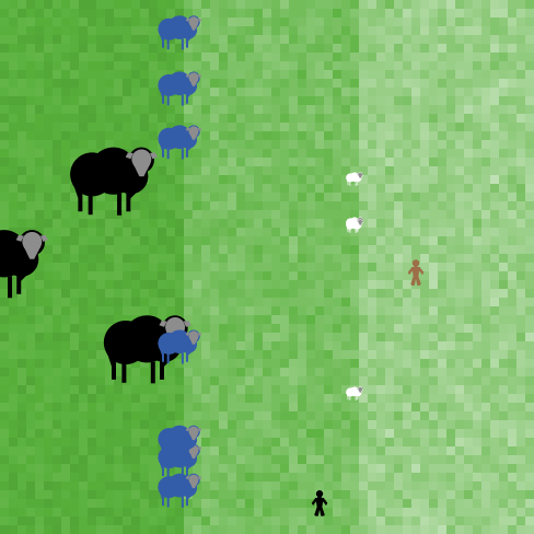 breed [sheep a-sheep] breed [shepherds shepherd] globals [ sheepless-neighborhoods ;; how many patches have no sheep in any neighboring patches? herding-efficiency ;; measures how well-herded the sheep are ones tens hundreds ] patches-own [ sheep-nearby ;; how many sheep in neighboring patches? ] shepherds-own [ ] to setup clear-all set-default-shape sheep "sheep" set-default-shape shepherds "person" ask patches [ set pcolor green + (random-float 0.8) - 0.4 if pxcor > 40 [ set pcolor (pcolor + 1) + (random-float 0.8) - 0.4 ] if pxcor > 20 [ set pcolor (pcolor + 1) + (random-float 0.8) - 0.4] ] ;; varying the green just makes it look nicer create-sheep num-sheep [ set color white set size 2 ;; easier to see setxy (random 20) + 40 random-ycor ] create-shepherds 1 [ set color brown set size 3 ;; easier to see setxy (random 20) + 40 random-ycor ] create-shepherds 1 [ set color black set size 3 ;; easier to see setxy (random 20) + 20 random-ycor ] reset-ticks end to go ask sheep with [not hidden?] [ if can-move? 1 = False ;; is the turtle blocked from moving foward 1 unit? [rt 180 ] ;; rotate 180 degree if xcor > 40 and size = 2 ;; is the sheep xcor greater than 40 [ ;; sheep are in the ones column facexy 40 (ycor + random 3 - random 3) fd 1 ] if xcor > 20 and xcor <= 40 and size = 5 ;; is the sheep xcor greater than 20 [ ;; sheep are in the ones column facexy 20 (ycor + random 4 - random 4) fd 1 ] if xcor >= 0 and xcor < 20 and size = 10 ;; is the sheep xcor greater than 0 [ ;; sheep are in the ones column wiggle ifelse can-move? 1 = False ;; is the turtle blocked from moving foward 1 unit? [rt 180 ] ;; rotate 180 degree [ fd 1 ] ] ] tick set ones 0 ask sheep [ if xcor < 41 and xcor > 39 and size = 2 [ set ones ones + 1 die ] if xcor < 21 and xcor > 19 and size = 5 [ set tens tens + 1 die ] ] print ones print tens tick ask one-of sheep [ if ones >= 10 [ hatch int ( ones / 10 ) [ setxy (random 15) + 20 random-ycor set size 5 ] set ones ones mod 10 ] hatch int ( ones mod 10 ) [ setxy 40 random-ycor set size 2 ] if tens >= 10 [ hatch int ( tens / 10 ) [ setxy (random 15) random-ycor set size 10 ] set tens tens mod 10 ] hatch int ( tens mod 10 ) [ setxy 20 random-ycor set size 5 ] set ones 0 set tens 0 ] ask sheep [ ifelse size = 10 [ set color black] [ ifelse size = 5 [set color blue] [set color white] ] ] end to wiggle ;; turtle procedure rt random 50 - random 50 end