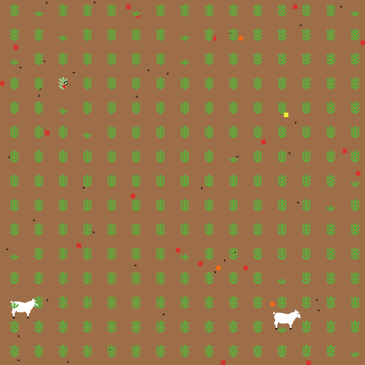 Parameters: INITIAL-NUMBER-SHEEP: The initial size of sheep population INITIAL-NUMBER-WOLVES: The initial size of wolf population SHEEP-GAIN-FROM-FOOD: The amount of energy sheep get for every grass patch eaten WOLF-GAIN-FROM-FOOD: The amount of energy wolves get for every sheep eaten SHEEP-REPRODUCE: The probability of a sheep reproducing at each time step WOLF-REPRODUCE: The probability of a wolf reproducing at each time step GRASS?: Whether or not to include grass in the model GRASS-REGROWTH-TIME: How long it takes for grass to regrow once it is eaten SHOW-ENERGY?: Whether or not to show the energy of each animal as a number