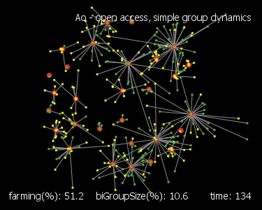 • display_mode: choose between visualizing (a) the proportion between farming and herding patches (green=farming, yellow=herding), and (b) the distribution of land units (colored by land use) among groups (red circles).Click refresh to apply changes when the simulation is paused.