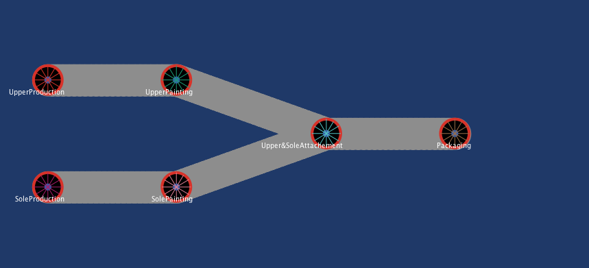 breed [shoes shoe] breed [soles sole] shoes-own [ shoe_type shoe_speed shoe_speed_limit shoe_speed_min] soles-own[ sole_type sole_speed sole_speed_limit sole_speed_min] globals[sample-shoe sample-sole] to setup clear-all setup-patches setup-turtles setup-links set-default-shape turtles "wheel" set-default-shape links "belt" ;watch sample-shoe ;watch sample sole reset-ticks end to start create-shoes number-of-shoes create-soles number-of-soles ask shoes [ ;set label "shoe head" set color white set xcor -23 set ycor 5 set shape "shoe_1" set size 5 set heading 90 set shoe_speed 2 ;+ random-float 0.9 set shoe_speed_limit 1 set shoe_speed_min 0 ] ask soles [ set color white set xcor -23 set ycor -5 set shape "sole_1" set size 5 set heading 90 set sole_speed 2 ;+ random-float 0.9 set sole_speed_limit 1 set sole_speed_min 0 ] set sample-shoe one-of shoes set sample-sole one-of soles end to go move-shoe move-sole tick end to move-shoe if any? shoes[ ask one-of shoes [ if any? other shoes-here [ fd 1] fd shoe_speed if xcor >= -11 [ set heading 110 set shape "shoe_2"] if xcor >= 3[ set heading 90 set shape "shoe_3"] if xcor >= 15[ ;set heading 90 set shape "shoe_box"] if xcor >= 22[ ask one-of shoes-here [die]] ]] ; ifelse show-shoe? ; [set label shoe_type ] ; [set label "" ] end to move-sole if any? soles[ ask one-of soles[ if any? other soles-here [ fd 1] fd sole_speed if xcor >= -11 [ set heading 70 set shape "sole_2"] if xcor >= 2[ ask one-of soles-here [die]] ]] ; ifelse show-sole? ; [set label sole_type ] ; [set label "" ] end to setup-patches ask patches [ set pcolor blue - 2] end to setup-conveyor-main ;if pycor < 10 and pycor > 4 and pxcor <= -5 [ set pcolor white] ;if pycor < -4 and pycor > -10 and pxcor <= -5[ set pcolor white] ;if pycor < 10 and pycor > 4 and pxcor <= -5 [ set pcolor white] end to setup-turtles create-turtles 6 ask turtle 1 [ set size 3 set xcor -23 set ycor 5 set label "UpperProduction" ] ask turtle 2 [ set size 3 set xcor -11 set ycor 5 set label "UpperPainting" ] ask turtle 3 [ set size 3 set xcor -23 set ycor -5 set label "SoleProduction" ] ask turtle 4 [ set size 3 set xcor -11 set ycor -5 set label "SolePainting" ] ask turtle 5 [ set size 3 set xcor 3 set ycor 0 set label "Upper&SoleAttachement" ] ask turtle 0 [ set size 3 set xcor 15 set ycor 0 set label "Packaging" ] ; foreach [ 2 4 6 9 ] [ ask turtles [ ; set xcor ? ; set ycor ?] ; ] end to setup-links ask turtle 1 [create-link-to turtle 2] ask turtle 3 [create-link-to turtle 4] ask turtle 2 [create-link-to turtle 5] ask turtle 4 [create-link-to turtle 5] ask turtle 5 [create-link-to turtle 0] ask links [set thickness 3] end
