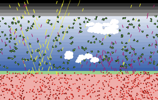 This is a model of energy flow in the earth, particularly heat energy. It shows the earth as rose colored, and the surface of the planet is represented by a black strip. Above the strip there is a blue atmosphere and black space at the top. Clouds and carbon dioxide (CO2) molecules can be added to the atmosphere. The CO2 molecules represent greenhouse gases that block infrared light that is emitted by the earth. Clouds block incoming or outgoing sun rays, influencing the heating up or cooling down of the planet.