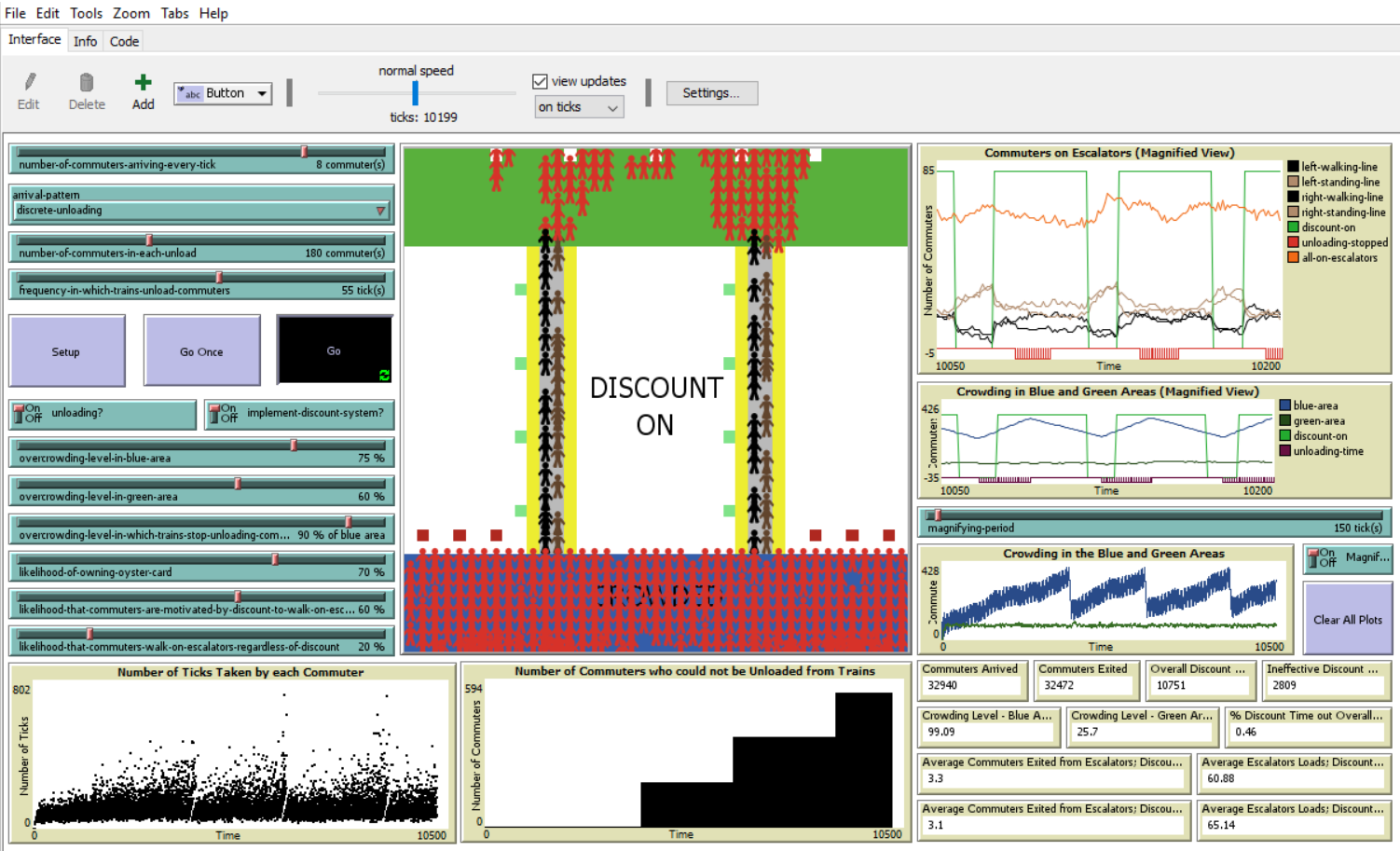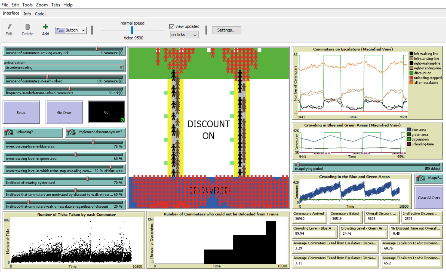 After an initial testing of the model, I came to a conclusion that although the escalators’ loads are less when implementing the discount system (the number in the Average Escalators Loads; Discount On monitor is often less than the number in the Average Escalators Loads; Discount Off monitor), the average number of commuters exiting escalators every tick is higher when implementing the discount system. That is because, in the case of implementing the discount system, there are more commuters walking on escalators, and accordingly, there is even a significantly large number of commuters exiting escalators from the walking lines because commuters moving faster on those lines than on the standing lines. I also concluded that the discount system has a positive influence in easing crowds, however, this influence sometimes is not strong enough to eliminate overcrowding in the blue area. Having said that, more comprehensive tests of the model are needed, which might include trying combinations of different arrival modes, different crowding levels, and different values/percentages of parameters related to commuters.
