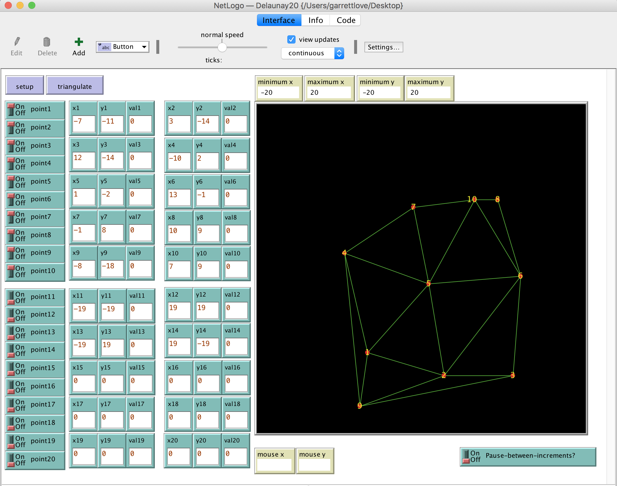 TRIANGULATE: When pressed, executes SETUP and then calculates and displayes the Delaunay triangulation of the active spatial points. Intermediate triangulations following the Bowyer-Watson algorithm are temporarily displayed but may not be visible.