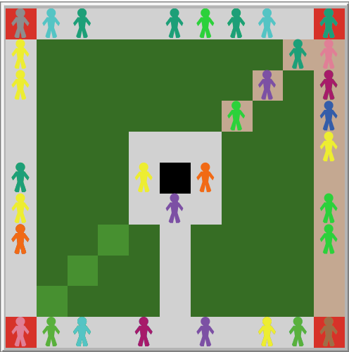 globals [ map-canvas turf-colors map-valids map-openings turf-color path-color opening-color obstacle-color has-setup? ] patches-own [ turf-health patch-type visited? active? path-cost next-path-cell ] turtles-own [ destination pavement-preference grass-aversion upcoming-path ] to setup-map clear-all set has-setup? true set-default-shape turtles "person" set turf-colors (list 37 56 56 54 53) let t 0 let p 1 let x 2 let o 3 ;; setup an initial map canvas set map-canvas (list ( list o p p p p p p p p p o ) ( list p t t t t p t t t t t ) ( list p t t t t p t t t t t ) ( list p t t t t p t t t t t ) ( list p t t t p p p t t t t ) ( list p t t t p x p t t t t ) ( list p t t t p p p t t t t ) ( list p t t t t t t t t t t ) ( list p t t t t t t t t t t ) ( list p t t t t t t t t t t ) ( list o p p p p p p p p p o ) ) resize-world 0 (length (item 1 map-canvas) - 1) 0 (length map-canvas - 1) ask patches [ set patch-type (item pxcor (item pycor map-canvas)) ] restart end to new-canvas clear-patches let #width-ratio (world-width - 1) / custom-world-width let #height-ratio (world-height - 1) / custom-world-height set-patch-size floor (patch-size * min (list #width-ratio #height-ratio)) resize-world 0 custom-world-width 0 custom-world-height ask patches [ set patch-type 0 ] update-map-data end to-report patch-name-to-type [ #name ] if #name = "turf" [ report 0 ] if #name = "pavement" [ report 1 ] if #name = "obstacle" [ report 2 ] if #name = "opening" [ report 3 ] end to patch-draw if mouse-down? [ ask patch mouse-xcor mouse-ycor [ set patch-type patch-name-to-type draw-patch-type ] update-map-data ask patch mouse-xcor mouse-ycor [ display ] ] end to update-map-data ; Store a list of valid patches to traverse (non-obstacles) set map-valids ( patches with [ patch-type != 2 ] ) set map-openings ( patches with [ patch-type = 3 ] ) ask patches with [ patch-type = 0 ] [ set pcolor last turf-colors set turf-health 1.0 ] ask patches with [ patch-type = 1 ] [ set pcolor 8 ] ask patches with [ patch-type = 2 ] [ set pcolor black ] ask patches with [ patch-type = 3 ] [ set pcolor red ] end to restart if (has-setup? != true) [ setup-map stop ] ask patches [ set plabel "" ] clear-turtles reset-ticks clear-all-plots update-map-data create-turtles population [ ;; randomly assign agent prefs using bounded normal distribution set pavement-preference max (list 0.1 (random-normal avg-pavement-preference (avg-pavement-preference * relative-standard-deviation / 100))) set grass-aversion max (list 0 (random-normal avg-grass-aversion (avg-grass-aversion * relative-standard-deviation / 100))) move-to one-of map-openings pick-destination ] end to pick-destination ;; pick an opening that isn't the one here set destination ( one-of map-openings with [ self != [patch-here] of myself ] ) set upcoming-path path-to-goal destination end to go if has-setup? != true [ setup-map ] ask turtles [ turtle-go ] ask patches with [ patch-type = 0 ] [ turf-go ] tick end to turtle-go ;; update destination if necessary if length upcoming-path = 0 [ ;; set a new destination pick-destination ] ;; move one cell down path to destination move-to item 0 upcoming-path set upcoming-path remove-item 0 upcoming-path end to turf-go set turf-health min list (turf-health + (growth-rate / 100)) 1 set turf-health max list 0 (turf-health - (turf-fragility / 100 * (count turtles-here))) set pcolor item (round (turf-health * 4)) turf-colors end to-report cell-cost [ #traveler ] if (patch-type = 0) [ report 1 + ([grass-aversion] of #traveler * turf-health) ] if (patch-type = 1 or patch-type = 3) [ report 1 / [pavement-preference] of #traveler ] report 1 end to-report list-path [ #path-so-far ] let #next-patch ([next-path-cell] of (last #path-so-far)) if ([path-cost] of (last #path-so-far)) = 0 [ report #path-so-far ] report list-path lput #next-patch #path-so-far end to-report path-to-goal [ #Goal ] let #Start patch-here let #traveler self ; clear all the information in the patches, and reset them ask map-valids [ set next-path-cell nobody set path-cost (2 ^ 20) set visited? false set active? false ] ask #Start [ set next-path-cell nobody set visited? false ] ask #Goal [ set path-cost 0 set visited? true set active? true ] while [not [visited?] of #Start] [ let #options map-valids with [active?] ifelse any? #options [ ask min-one-of #options [path-cost] [ let #path-cost-father path-cost set active? false let #valid-neighbors neighbors with [member? self map-valids] ask #valid-neighbors [ ;; get potential path cost, multiply cell cost by distance to account for diagonals let #new-path-cost #path-cost-father + (distance myself * cell-cost #traveler) if #new-path-cost < path-cost [ set next-path-cell myself set visited? true set active? true set path-cost #new-path-cost ] ] ] ] [ ;; We've run out of options before finding the Start show "No path available" ] ] let #future-path list-path (list #Start) report #future-path end