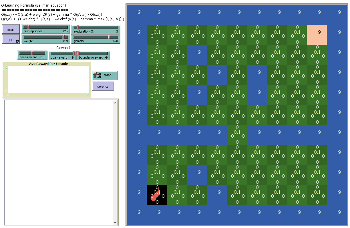 ;; Adapted from a model by Joe Roop: http://ccl.northwestern.edu/netlogo/models/community/Reinforcement Learning Maze ;; Coppyright Russ Abbott (Russ.Abbott@gmail.com) ;; This work is licensed under the Creative Commons Creative Commons Attribution-NonCommercial-ShareAlike 4.0 International Public License. ;; To view a copy of the license, visit https://creativecommons.org/licenses/by-nc-sa/4.0/legalcode. patches-own [ Qlist reward qa-elts ] breed [walkers walker] breed [qa-labels qa-label] globals [ episode goal-color goal-patch start-patch Hlist north east south west ] ;;;;;;;;;;;;;;;;;;;;;;;;;;;;;;;;;;;; ;;;;;;;;;;;;;;;;;;;;;;;;;;;;;;;;;;;; to setup ca set north 0 set east 90 set south 180 set west 270 set Hlist (list west north east south) setup-maze create-walkers 1 [ set shape "bug" set color red + 1 set size 0.8 move-to start-patch set heading 45] set episode 1 set-current-plot "Ave Reward Per Episode" end to setup-maze ask patches [ let qa-elts-commands (list (list west 0.25) (list north 0.35) (list east 0.3) (list south 0.40) ) set qa-elts [] set Qlist [0 0 0 0] sprout 4 [ ;; These are four turtles which display the qa values at the patch edges set size 0 set heading east fd 0.1 set heading south fd 0.1 let command first qa-elts-commands set qa-elts-commands but-first qa-elts-commands set heading first command fd second command set label 0 set qa-elts lput self qa-elts ] ] set-maze-elements end to set-maze-elements clear-drawing ask patches [ set pcolor default-color self ] set start-patch patch -4 -4 ask start-patch [set pcolor black] set goal-patch patch 4 4 set goal-color orange + 3 ask goal-patch [set pcolor goal-color ] setup-blockades make-passage set-rewards ask patches [ foreach qa-elts [ qa-elt -> ask qa-elt [ set hidden? pcolor = blue or pcolor = goal-color ] ] ] end to setup-blockades ask patches with [pxcor = max-pxcor or pxcor = (- max-pxcor) or pycor = max-pycor or pycor = (- max-pycor) or pycor = -1] [set pcolor blue] foreach (list patch -1 2 patch 1 1 patch -2 -3) [ p -> ask p [ set pcolor blue ask n-of (ifelse-value (p = patch -2 -3) [1] [2]) neighbors [set pcolor blue]]] end to make-passage ask one-of patches with [pycor = -1 and pxcor > (- max-pxcor + 3 ) and pxcor < max-pxcor - 3] [ set pcolor default-color self ask patches with [pxcor = [pxcor] of myself and (pycor = [pycor] of myself + 1 or pycor = [pycor] of myself - 1) ] [ set pcolor default-color self ] ask one-of patches with [(pycor = [pycor] of myself + 1 ) and (pxcor = [pxcor] of myself + 1 or pxcor = [pxcor] of myself - 1) ] [ set pcolor default-color self ] ] end to set-rewards ask patches [set reward ifelse-value (pcolor = blue) [boundary-reward] [base-reward] ] ask goal-patch [ set reward goal-reward ] ask patches [sprout 1 [ set size 0 set label-color ifelse-value (myself = goal-patch) [black] [yellow + 2] set label [reward] of myself set heading east fd 0.2 ] foreach (list item 0 qa-elts item 2 qa-elts) [qa-elt -> ask qa-elt [set heading south fd 0.1]] ] end to-report default-color [a-patch] report green - 2 + ifelse-value is-odd? ([pxcor] of a-patch + [pycor] of a-patch) [0.2] [-0.2] end ;;;;;;;;;;;;;;;;;;;;;;;;;;;;;;;;;;;; ;;;;;;;;;;;;;;;;;;;;;;;;;;;;;;;;;;;; to go if (episode > num-episodes) [stop] set trace? false one-trip end to one-trip clear-drawing ;; Don't explore when running with trace-path let path episode-path ifelse-value trace? [0] [exploration-% / 100] let lng length path let lngsum sum path let avg-reward lngsum / lng plot avg-reward output-print (word " " episode "; path-length: " lng "; avg-reward: " precision avg-reward 2) set episode episode + 1 end to-report episode-path [explore-%] let r-episode [] ask walkers [ pen-up move-to start-patch if trace? [pen-down set pen-size 3] while [ [pcolor] of patch-here = default-color self or patch-here = start-patch] [ let Qmax max Qlist ;--get max from the Qlist values of the current patch let dirp 0 ifelse (random-float 1 < explore-%) [ set heading one-of Hlist ;--pick random direction set dirp position heading Hlist ;--find dir's position in the Hlist array ] [ set dirp one-of all-positions Qmax Qlist ;; Qmax may appear multiple times in Qlist. Select one at random. set heading item dirp Hlist ] let Qa item dirp Qlist ;--find the value in Qlist with the same position as in the Hlist let r [reward] of patch-ahead 1 set r-episode lput r r-episode ;-- Q-learning update function let Qmax' max [Qlist] of patch-ahead 1 set Qa precision ( (1 - weight) * Qa + weight * (r + gamma * Qmax') ) 3 ;--perform Q-Learning set Qlist replace-item dirp Qlist Qa ask patch-here [ (foreach qa-elts Qlist [ [t q] -> ask t [ set label precision q 1]] )] fd 1 ] ] report r-episode end ;;;;;;;;;;;;;;;;;;;;;;;;;;;;;;;;;;;; ;;;;;;;;;;;;;;;;;;;;;;;;;;;;;;;;;;;; to-report all-positions [elt a-list] report all-positions' elt a-list 0 end to-report all-positions' [elt a-list n] if empty? a-list [report []] let positions all-positions' elt (but-first a-list) ( n + 1 ) if (first a-list = elt) [set positions fput n positions] report positions end to-report is-odd? [n] report n mod 2 = 1 end to-report list-to-string [a-list sep] report reduce [ [so-far next] -> (word so-far sep next)] a-list end to-report second [a-list] report first but-first a-list end