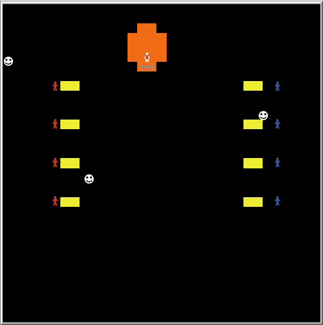 patches-own [ table-number ];;for tables globals[counter_patches ;; for cafe_counter point ;;for break Female_Chairs_Chairs Male_Chairs ] breed [servers server] breed [waiter waiters] breed [servant servants] turtles-own [ ;;for average waiting time Timerr orderitem ] to setup ca setup-chiars create-turtles students [ set Timerr Ave_time_to_wait ;;setTimerr ticks set shape "person" setxy -3 -14 set color one-of [pink blue] set size 1.5 ] set point 20 ask patches[ setup-table recolor-patch ] create-servant 3[ setxy random-xcor random-ycor set color white set shape "person service" set size 2 ] create-waiter 1[ setxy -1.5 11 set heading 180 set color orange set shape "person" ] create-turtles 1 [ set shape "strawberry" setxy -2 10 set size 1 set color red ] create-turtles 1 [ set shape "strawberry" setxy -1 10 set size 1 set color red ] create-turtles 1 [ set shape "strawberry" setxy -1.5 10 set size 1 set color red ] reset-ticks end to setup-server set-default-shape servers "Person" ask n-of 3 (patches with [pcolor = brown - 12 or pcolor = white]) [sprout-servers 1 [set color 9.9 set size 2]] end to setup-table ;;setting tables if (distancexy (-0.1 * max-pxcor) 12) < 3 [ set pcolor turquoise ] set counter_patches patches with [ (distancexy (-0.1 * max-pxcor) -14) < 3 ] ask counter_patches [ set pcolor white ] if (distancexy (0.6 * max-pxcor) -3) < 0.6 [ set table-number 1 set pcolor violet ] if (distancexy (0.6 * max-pxcor) 3) < 0.6 [ set table-number 3 ] if (distancexy (-0.6 * max-pxcor) -3) < 0.6 [ set table-number 5 set pcolor violet] if (distancexy (-0.6 * max-pxcor) 3) < 0.6 [ set table-number 7 set pcolor violet] end to recolor-patch ;; patch procedure if table-number = 1 [ set pcolor violet ] if table-number = 2 [ set pcolor violet ] if table-number = 3 [ set pcolor violet ] end to go move-turtles ask servant [ rt one-of [-90 0 90] ;; go left, straight, or right forward 1 ] ask turtles with [color = pink or color = blue] [ if ticks >= point or Timerr = 0 [ move-to one-of patches with [pcolor = white] ht ] ] if ticks >= point [stop] tick end to setup-chiars ask patches [set pcolor black] set Female_Chairs_Chairs (patch-set patch 9 2 patch 9 4 patch 9 2 patch 9 -4 patch 9 -2 );;right side female setup ask Female_Chairs_Chairs [set pcolor brown] set Male_Chairs(patch-set patch -10 -4 patch -10 4 patch -10 -2 patch -10 2 );;left side male setup ask Male_Chairs [set pcolor green] end to move-turtles ask turtles [ if color = blue [ lt random 30 rt random 30 fd 2 move-to one-of patches with [pcolor = green]] if color = pink [ lt random 30 rt random 30 fd 2 move-to one-of patches with [pcolor = brown] ] set Timerr Timerr - 1 ] end
