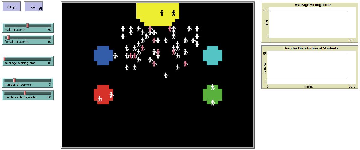 breed [males male] breed [females female] breed [servers server] males-own [cafe-time status] females-own [cafe-time status] globals [counter] to setup clear-all setup-cafeteria reset-ticks end to setup-cafeteria make-counter make-tables make-students make-servers set counter 0 end to make-counter ask patch (0) (max-pycor) [ ask patches with [ distance myself < 6 ] [ set pcolor yellow ] ] end to make-tables ask patch (-0.6 * max-pxcor) 5 [ ask patches with [ distance myself < 2.5 ] [ set pcolor blue ] ] ask patch (0.6 * max-pxcor) 5 [ ask patches with [ distance myself < 2.5 ] [ set pcolor cyan ] ] ask patch (-0.6 * max-pxcor) -5 [ ask patches with [ distance myself < 2.5 ] [ set pcolor red ] ] ask patch (0.6 * max-pxcor) -5 [ ask patches with [ distance myself < 2.5 ] [ set pcolor green ] ] end to make-students create-ordered-males male-students [ set shape "person" set color white move-same-students ] create-ordered-females female-students [ set shape "person" set color pink move-same-students ] end to move-same-students set size 1.5 set heading 0 setxy (10 + random -22) min-pycor set cafe-time average-waiting-time set status 0 end to make-servers create-servers number-of-servers [ set shape "person" set color black set size 1.5 setxy (1 + random 5) (max-pycor - 2) ] end to go ask males [ if pycor != 12 [ move-students ] ] ask females [ if pycor != 12 [ move-students ] ] tick end to move-students if (ticks mod 60 = 0) [ set cafe-time (cafe-time - 1) ] if (cafe-time = 0) [ die ] if counter = 0 [ if(status = 0) [ move-to patch -12 -5 set status 1 set counter counter + 1 ] ] if counter = 1 [ if(status = 0) [ move-to patch -15 -6 set status 1 set counter counter + 1 ] ] if counter = 2 [ if(status = 0) [ move-to patch 14 -3 set status 1 set counter counter + 1 ] ] if counter = 3 [ if(status = 0) [ move-to patch 14 -7 set status 1 set counter counter + 1 ] ] if (status = 0) [ fd random 2 ] set label cafe-time end