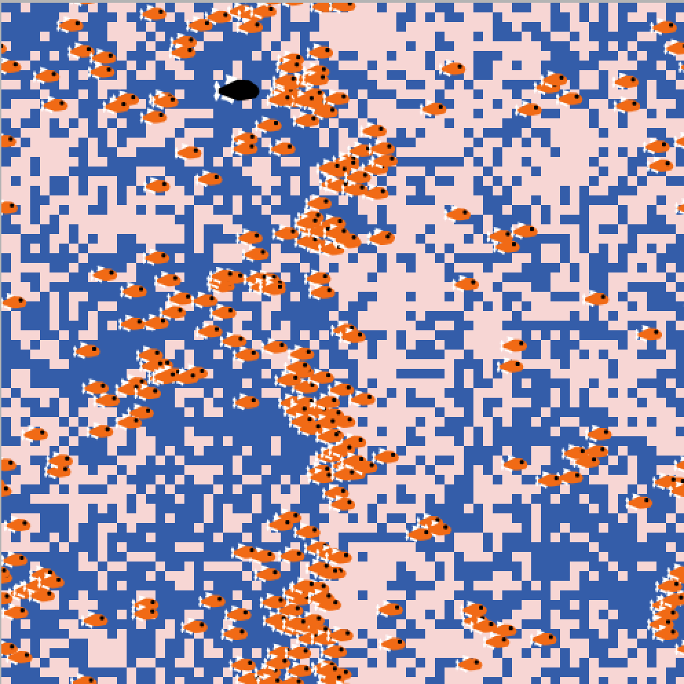 We changed the behavior of the patches so that they might reflect coral within a reef. We changed the shape and color of the predator so that it might reflect a reef shark within a reef ecosystem. We also changed the shape and color of the birds so that they reflect parrotfish within a reef ecosystem. When the orange parrotfish pass over pink coral, they effectively "eat" the coral and gain energy. This results in the coral changing to a blue color which represents water or dead coral. We also added an energy cost to movement. As the fish swim, they use up energy until they are able to regain that energy by eating coral or die. If fish lose all of their energy, they die. If fish have enough energy, they reproduce. Both of these properties were changes which we made. Finally, we made the coral regenerate so that the fish have a renewing supply of energy. These additions result in some interesting emergent properties. Fish which swim towards the back of the school usually are not able to eat the coral because fish towards the front of the school have already gotten to it first. These fish are usually the ones to die. Fish towards the front of the school, however, eat most of the coral. This causes them to gain enough energy to reproduce. When the simulation is started, the fish population changes by increasing or declining until the fish reach a sustainable population for their environment. We added a graph of fish population over time on the interface to monitor this behavior.