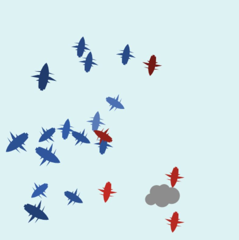 What other factors of a naval battle are missing from this model? How might you introduce goals into the simulations, where each ship might want to reach a certain point of land or eliminate a certain number of enemy ships? These factors could be added to influence morale of the ships/soldiers.