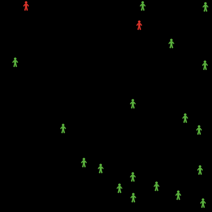 turtles-own [sick? recovered? susceptible? sick-time ] globals [ %infected %recovered %susceptible ] to setup clear-all setup-turtles update-global-variables ;update-display reset-ticks end to setup-turtles create-turtles number-people [setxy random-xcor random-ycor set shape "person" set size 1.5 set sick-time 0 set sick? 0 set recovered? 0 set susceptible? 1 set color green] ask n-of 2 turtles [set sick? 1 set susceptible? 0 set color red] end to go ask turtles [ move age if sick? = 1 [recover] if sick? = 1 [infect] ] update-global-variables ;update-display tick end to update-global-variables if count turtles > 0 [set %infected (count turtles with [sick? = 1] / count turtles) * 100 set %recovered (count turtles with [recovered? = 1] / count turtles) * 100 set %susceptible (count turtles with [susceptible? = 1] / count turtles) * 100 ] end ;to update-display ;ask turtles ;[if shape != turtle-shape [set shape turtle-shape] ; ifelse sick? = 1 [set color red] [ifelse recovered? = 1 [set color grey][set color green]]] ;end to move rt random 100 lt random 100 fd 1 end to infect ask other turtles-here with [sick? = 0 and recovered? = 0] [if random-float 100 < infectiousness [set sick? 1 set susceptible? 0 set color red]] end to age ask turtles with [sick? = 1] [set sick-time sick-time + 1] end to recover if sick-time > (duration * 100) [if random-float 100 < 100 [set recovered? 1 set sick? 0 set susceptible? 0 set color grey] ] end