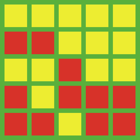 globals [lights counter mouse-clicked? proceed? total-steps] patches-own [ name state flag] to setup3x2 ca ask patches [ if pxcor mod 10 = 0 [ set pcolor green ] if pycor mod 15 = 0 [ set pcolor green ] setup-lights3x2 ] end to setup-lights3x2 ; X line 1 let light11 patches with [ pxcor > 0 and pxcor < 10 and pycor > 0 and pycor < 15 ] let light12 patches with [ pxcor > 10 and pxcor < 20 and pycor > 0 and pycor < 15 ] let light13 patches with [ pxcor > 20 and pxcor < 30 and pycor > 0 and pycor < 15 ] ask light11 [ set pcolor red set name "light11"] ask light12 [ set pcolor red set name "light12"] ask light13 [ set pcolor red set name "light13"] ; X line 2 let light21 patches with [ pxcor > 0 and pxcor < 10 and pycor > 15 and pycor < 30] let light22 patches with [ pxcor > 10 and pxcor < 20 and pycor > 15 and pycor < 30 ] let light23 patches with [ pxcor > 20 and pxcor < 30 and pycor > 15 and pycor < 30 ] ask light21 [ set pcolor red set name "light21"] ask light22 [ set pcolor red set name "light22"] ask light23 [ set pcolor red set name "light23"] ask patches with [ name = "light21" or name = "light22" or name = "light13" ][ set pcolor yellow set state true ] set total-steps 1 end to setup5x5 ca set total-steps 1 set counter 0 ask patches [ set state false set name "light00" if pxcor mod 6 = 0 [ set pcolor green ] if pycor mod 6 = 0 [ set pcolor green ] ] setup-lights5x5 ask patches with [ ; name = "light24" or ; name = "light25" or name = "light32" or name = "light55" or name = "light23" or name = "light41" or name = "light52" or name = "light11" ][ set pcolor yellow set state true ] end to go check-mouse end to solve-game3x2 let i 3 let j 0 repeat 2 [ set i i - 1 set j 0 repeat 3 [ set j j + 1 let my-name word word "light" i j ask patches with [ name = my-name ] [ let a read-from-string (item 5 name) let b read-from-string (item 6 name) let up-name word word "light" ( a + 1 ) b ask patches with [ name = up-name] [ if pcolor = yellow [ set pcolor red if proceed? = false [ set total-steps total-steps + 1 ] set proceed? true ] ] if proceed? = true [ flip-lights my-name user-message " Press OK to proceed for next step"] ] ] ] ifelse count patches with [ pcolor = yellow ] > 0 [ user-message " This configuration is not solve able" ] [ user-message word "Game solved in steps: " total-steps ] end to solve-game let i 5 let j 0 repeat 4 [ set i i - 1 set j 0 repeat 5 [ set j j + 1 let my-name word word "light" i j ask patches with [ name = my-name ] [ let a read-from-string (item 5 name) let b read-from-string (item 6 name) let up-name word word "light" ( a + 1 ) b ask patches with [ name = up-name] [ if pcolor = yellow [ set pcolor red if proceed? = false [ set total-steps total-steps + 1 ] set proceed? true ] ] if proceed? = true [ flip-lights my-name user-message " Press OK to proceed for next step"] ] ] ] ifelse count patches with [ pcolor = yellow ] > 0 [ user-message " This configuration is not solve able" ] [ user-message word "Game solved in steps: " total-steps ] end to flip-lights [ my-name ] ask patches with [ name = my-name] [ ifelse pcolor = yellow [set pcolor red][set pcolor yellow] ] set proceed? false let a read-from-string (item 5 name) let b read-from-string (item 6 name) let left-name word word "light" a ( b - 1 ) ask patches with [ name = left-name] [ ifelse pcolor = yellow [set pcolor red][set pcolor yellow] ] let right-name word word "light" a ( b + 1 ) ask patches with [ name = right-name] [ ifelse pcolor = yellow [set pcolor red][set pcolor yellow] ] let bottom-name word word "light" ( a - 1 ) b ask patches with [ name = bottom-name] [ ifelse pcolor = yellow [set pcolor red][set pcolor yellow] ] end to check-mouse ifelse mouse-down? [ if not mouse-clicked? [ set mouse-clicked? true ask patch mouse-xcor mouse-ycor [ ; Start ; ifelse pcolor = yellow [set pcolor red][ set pcolor yellow ] ask patches with [ pcolor != green and name = [name] of patch mouse-xcor mouse-ycor] [ ifelse state = false [set pcolor yellow set state true][set pcolor red set state false] ] let a read-from-string (item 5 name) let b read-from-string (item 6 name) let left-name word word "light" a (b + 1) ask patches with [ pcolor != green and name = left-name] [ ifelse state = false [set pcolor yellow set state true][set pcolor red set state false] ] let right-name word word "light" a ( b - 1) ask patches with [ pcolor != green and name = right-name] [ ifelse state = false [set pcolor yellow set state true][set pcolor red set state false] ] let top-name word word "light" (a + 1) b ask patches with [ pcolor != green and name = top-name] [ ifelse state = false [set pcolor yellow set state true][set pcolor red set state false] ] let botton-name word word "light" ( a - 1) b ask patches with [ pcolor != green and name = botton-name] [ ifelse state = false [set pcolor yellow set state true][set pcolor red set state false] ] ] ;end ] ] [ set mouse-clicked? false ] end to setup-lights5x5 ; X line 1 let light11 patches with [ pxcor > 0 and pxcor < 6 and pycor > 0 and pycor < 6 ] let light12 patches with [ pxcor > 6 and pxcor < 12 and pycor > 0 and pycor < 6 ] let light13 patches with [ pxcor > 12 and pxcor < 18 and pycor > 0 and pycor < 6 ] let light14 patches with [ pxcor > 18 and pxcor < 24 and pycor > 0 and pycor < 6 ] let light15 patches with [ pxcor > 24 and pxcor < 30 and pycor > 0 and pycor < 6 ] ask light11 [ set pcolor red set name "light11"] ask light12 [ set pcolor red set name "light12"] ask light13 [ set pcolor red set name "light13"] ask light14 [ set pcolor red set name "light14"] ask light15 [ set pcolor red set name "light15"] ; X line 2 let light21 patches with [ pxcor > 0 and pxcor < 6 and pycor > 6 and pycor < 12 ] let light22 patches with [ pxcor > 6 and pxcor < 12 and pycor > 6 and pycor < 12 ] let light23 patches with [ pxcor > 12 and pxcor < 18 and pycor > 6 and pycor < 12 ] let light24 patches with [ pxcor > 18 and pxcor < 24 and pycor > 6 and pycor < 12 ] let light25 patches with [ pxcor