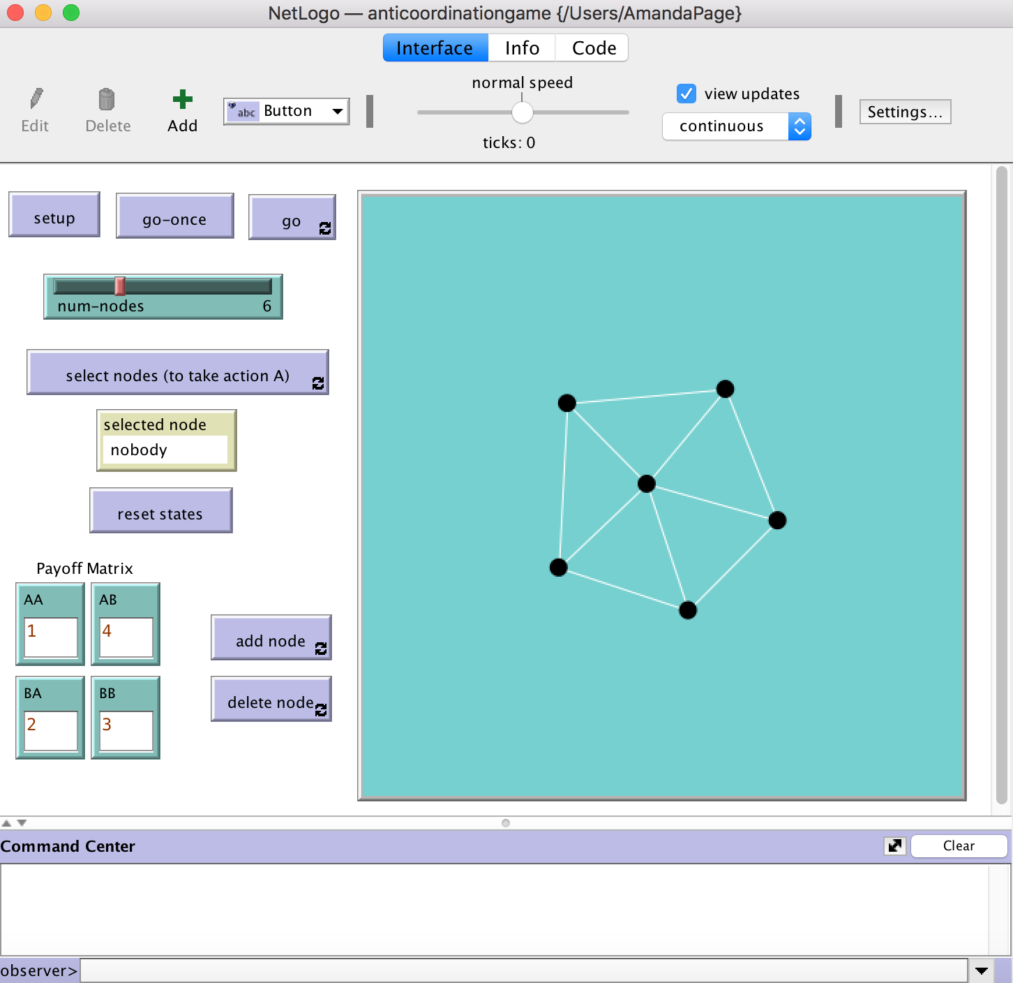 The SELECT NODES button allows the user to select agents with the mouse. The selected agents will take action A (at least initially). The 'selected node' box will show the number of the turtle the mouse is hovering over while selecting nodes.