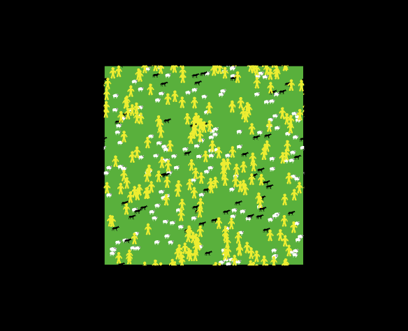 Parameters: MODEL-VERSION: Whether we model sheep wolves and grass or just sheep and wolves INITIAL-NUMBER-SHEEP: The initial size of sheep population INITIAL-NUMBER-WOLVES: The initial size of wolf population SHEEP-GAIN-FROM-FOOD: The amount of energy sheep get for every grass patch eaten (Note this is not used in the sheep-wolves model version) WOLF-GAIN-FROM-FOOD: The amount of energy wolves get for every sheep eaten SHEEP-REPRODUCE: The probability of a sheep reproducing at each time step WOLF-REPRODUCE: The probability of a wolf reproducing at each time step GRASS-REGROWTH-TIME: How long it takes for grass to regrow once it is eaten (Note this is not used in the sheep-wolves model version) SHOW-ENERGY?: Whether or not to show the energy of each animal as a number