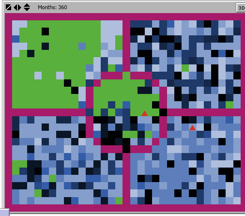 Use the slider for the user-defined input parameters, as noted above, to establish initial conditions. The user can then define other variables for user-defined inputs. Push the "Set Up" button to establish patch and potential investor distribution. You can push the "Go-Once" button, which will run all procedures automatically.