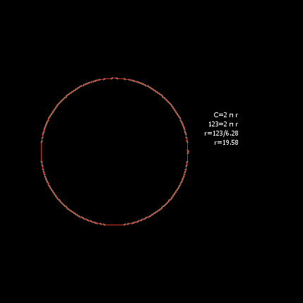 to vai let cx -4 let cy 0 let r 8 let p2r ( 2 * pi * r ) let step p2r / 360 crt 1 [ ;; 0 setxy cx + r cy pd set heading 0 while [ p2r > 0 ] [ lt 1 fd step set p2r p2r - step ] die ] let y 0 let x 0 set circunferência circunferência set x circunferência set y 2 * pi set x x / y print x set x precision x 2 set y precision y 2 crt 1 [ set hidden? not hidden? set xcor 9 set ycor 4 set plabel (word "C=2 π r") ] crt 1 [ set hidden? not hidden? set xcor 9 set ycor 3 set plabel (word circunferência"=2 π r") ] crt 1 [ set hidden? not hidden? set xcor 9 set ycor 2 set plabel (word "r="circunferência"/"y) ] crt 1 [ set hidden? not hidden? set xcor 9 set ycor 1 set plabel (word "r="x) ] end to limpar clear-all end