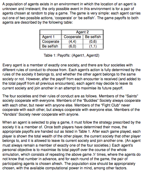 extensions [rnd] breed [sheng s];;0 saint cooperate with every one;;圣徒俱乐部 跟任何人都合作 breed [huoban h];;1 buddies only cooperate with buddied member;;伙伴俱乐部 只跟自己阵营的人合作 breed [boji b];;4 fight club only cooperate with other club member;;搏击俱乐部 只跟外人合作 breed [youda y];;6 youda cooperate with no one ;;犹大俱乐部 跟任何人都不合作 turtles-own [ fitness ;;be careful we have 256 bits ,and each bit range from [0 1 4 6](using global rulers which means Any two numbers add up to be unique ) ga-bits ;;4 bits range from [0 1 2 3] ;;we have 6 bits and the first bit means 2 round before which club we choose ,the second bit means which bit our opponent choose . ;;why we use [0 1 2 3], because is more simply to calculate the history-number ,0->saint 1->buddies 2->fight club 3->youda club-bits ;; to see if this round we have been palyed or not isgambled ;;256 bits also range from [0 1 4 6] next-club-bits;;64位 ;; history-number = 64 * item 0 club-bits + 16 * item 1 club-bits + 4 * item 2 club-bits + 1 * item 3 club-bits history-number max-fitness ;; 4 * 256 bits ,if our clu-bits is [0 0 0 1] then ourhistory-number is 1,if our this round is 0(saint) then we choose 0 *256 + 1(1 means history-number) ,if this round we are 1(buddies) then we choose 1*256 + 1 and so on payoff ;; 4 * 256 bits, and the rule is equal to payoff ,if our club-bits is [0 0 0 1] .if this round is 4(fight-club),then our step[2*256 + 1]++,if this round we are youda ,then step[3*256 + 1]++ step;记录这个历史已经走了多少次 ] ;;;;;;;;;;;;;;;;;;;;;;;;;;;;;;;;;;;;;;;;;;;;;;;;;;;;;;;;;;;;;;;;;;;;;;;;;;;;;;;;;;;;;;;;;;;;;;;;;;;;;;;;;;;;;;;;;;;;;;;;;;;;;;;;;;;;;;;;;;;;;;;;;;;;;;;;;;;;;;;;;;;;;;;;;;;;;;; ;;;;;if this round A is youda(6) and club-bits is [0 0 1 2] which means the first round we are saint ,our opponent is saint;;;;;;;;;;;;;;;;;;;;;;;;;;;;;;;;;;;;;;;;;;;;;;;;;;; ;;;;;and the second round we are buddies and our opponent is fight club ,and if the third round A's opponent B is saint(0) and club-bits is [ 1 2 3 0];;;;;;;;;;;;;;;;;;;;;;;;; ;;;;;A club-bits [0 0 1 2]->[1 2 3 0] B club-bits[1 2 3 0]->[3 0 0 3];;;;;;;;;;;;;;;;;;;;;;;;;;;;;;;;;;;;;;;;;;;;;;;;;;;;;;;;;;;;;;;;;;;;;;;;;;;;;;;;;;;;;;;;;;;;;;;;;;;;;;;;;; ;;;;;and A history-number is 6 ,ga-bits[6] means which club we are chooseing now ,and then we use next-club-bits[6] to cover ga-bits[6] ;;;;;;;;;;;;;;;;;;;;;;;;;;;;;;;;;;;;;;; ;;;;;and next-club-bits[6] covered and base on the weight : payoff[x * 256 + 6]/sum( payoff[ 0 * 256 + 6]+payoff[1 * 256 + 6]+payoff[2 * 256 + 6]+payoff[ 3* 256 + 6]);;;;;;;;; ;;;;;and now our history-number=1*64+2*16+3*4+0*1 = 108 ;;;;;;;;;;;;;;;;;;;;;;;;;;;;;;;;;;;;;;;;;;;;;;;;;;;;;;;;;;;;;;;;;;;;;;;;;;;;;;;;;;;;;;;;;;;;;;;;;;;;;;;;;;;;;;;;;;;;;;; globals[ co_xunhuan; test co test test-list forget_payoff ] to setup clear-all ;;change shape set-default-shape sheng "person doctor" set-default-shape boji "person soldier" set-default-shape huoban "person service" set-default-shape youda "person lumberjack" ;;set ga-bits's mutate_probability set mutate_probability 0.1 ;;this is nextclub's mutate_probability set nextclub_mutate_probability 0.25 ;;set each club member let pop floor( population / 4) set test 0 set test-list [1 2 3 4 5] set forget_payoff 0 create-sheng pop[ setxy random-pxcor random-pycor set ga-bits n-values 256 [one-of [0 1 4 6]];;我们得找到相应的那个位置去修改为0 set next-club-bits n-values 256 [one-of [0 1 4 6]] set club-bits n-values 4 [one-of [0 1 2 3]];从3个历史变成2个历史吧 let number (64 * item 0 club-bits + 16 * item 1 club-bits + 4 * item 2 club-bits + 1 * item 3 club-bits) ;list 不再是list[1] 而是 item 1 list set ga-bits replace-item number ga-bits 0 set isgambled 0 ;; which mean if isgambled is 0 set history-number number set size 2 set payoff n-values (256 * 4 ) [ 1 ] set step n-values (256 * 4) [1] ] create-huoban pop[ setxy random-pxcor random-pycor set ga-bits n-values 256 [one-of [0 1 4 6]] set next-club-bits n-values 256 [one-of [0 1 4 6]] set club-bits n-values 4 [one-of [0 1 2 3]] let number 64 * item 0 club-bits + 16 * item 1 club-bits + 4 * item 2 club-bits + 1 * item 3 club-bits ;list 不再是list[1] 而是 item 1 list set ga-bits replace-item number ga-bits 1 set isgambled 0 set history-number number set size 2 set payoff n-values (256 * 4 ) [ 1 ] set step n-values (256 * 4) [1] ] create-boji pop[ setxy random-pxcor random-pycor set ga-bits n-values 256 [one-of [0 1 4 6]] set next-club-bits n-values 256 [one-of [0 1 4 6]] set club-bits n-values 4 [one-of [0 1 2 3]] let number 64 * item 0 club-bits + 16 * item 1 club-bits + 4 * item 2 club-bits + 1 * item 3 club-bits ;list 不再是list[1] 而是 item 1 list set ga-bits replace-item number ga-bits 4 set isgambled 0 set history-number number set size 2 set payoff n-values (256 * 4 ) [ 1 ] set step n-values (256 * 4) [1] ] create-youda pop[ setxy random-pxcor random-pycor set ga-bits n-values 256 [one-of [0 1 4 6]] set next-club-bits n-values 256 [one-of [0 1 4 6]] set club-bits n-values 4 [one-of [0 1 2 3]] let number 64 * item 0 club-bits + 16 * item 1 club-bits + 4 * item 2 club-bits + 1 * item 3 club-bits ;list 不再是list[1] 而是 item 1 list set ga-bits replace-item number ga-bits 6 set isgambled 0 set history-number number set size 2 set payoff n-values (256 * 4 ) [ 1 ] set step n-values (256 * 4) [1] ] reset-ticks end to calculate-fitness ;do nothing end to gamble let opponent one-of other turtles-here ; cuz the turtles move randomly,if remain only 2-4 turtles not gamble ,which will waste lots of times if we wait this 2-4 turtles to meet each other ; if we have 200 pop ,and 20 people not played yet . ;we first set buf = self when we find the opponent's isgambled =0 and != buf ,then we match this two to gamble let buf self ;if self b87 let count_remain 0 if count turtles with [isgambled = 0] < population / 10[ ask turtles with [isgambled = 