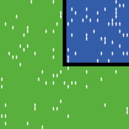 The green part of the world represents the homes of the patrons, while the blue part of the world represents the El Farol Bar. Over time the attendance will increase and decrease but its mean value comes close to the OVERCROWDING-THRESHOLD.