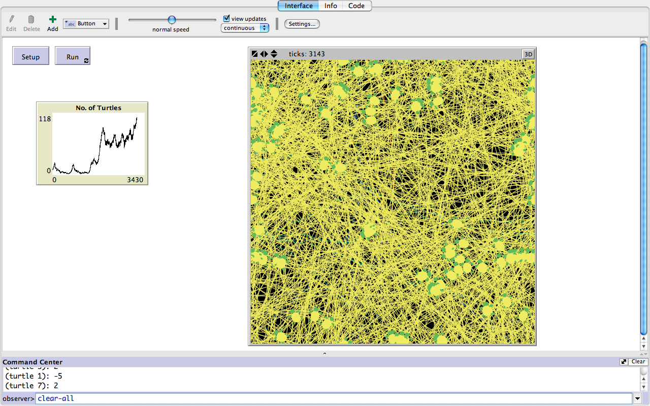 turtles-own [ age ] to setup clear-all create-turtles 10 [ setxy 0 0 set size 2 set shape "turtle" set age 0 pendown ] reset-ticks end to go every .05 [ ask turtles [ wander maybe-reproduce set age age + 1 maybe-die ] tick ] end to wander rt (random 11) - 5 fd .2 end to maybe-reproduce if(age > 10 and age < 65)[ let chanceRePro random 100 if(chanceRePro < 2) [ reproduce ] ] end to reproduce hatch 1 [ set age 0 ] end to maybe-die if(age > 75)[ let chanceOldAge random 126 ifelse(age > 200) [ die penup ] [ if(chanceOldAge > (200 - age)) [ die penup ] ] ] end