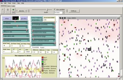 Humans have founded a colony on a new planet. Earth has overheated. The cause is disputed, but now they have a chance to start afresh. On this planet the oxygen produced by forests and the carbon dioxide produced by factories diffuse slowly through the atmosphere producing pockets of the gases. There are three kinds of human agents - climate scientists, anti-scientists and citizens. Climate scientists collect temperature data. The user can choose between two decision-making systems. In the case of climate scientist quorum, the system is modelled after honeybees. When a quorum of scientists agree that climate change is happening, policy makers agree to either plant more forests and demolish factories or the other way around depending on the direction of temperature change. In the case of public majority, there has to be a majority consensus before action is taken.