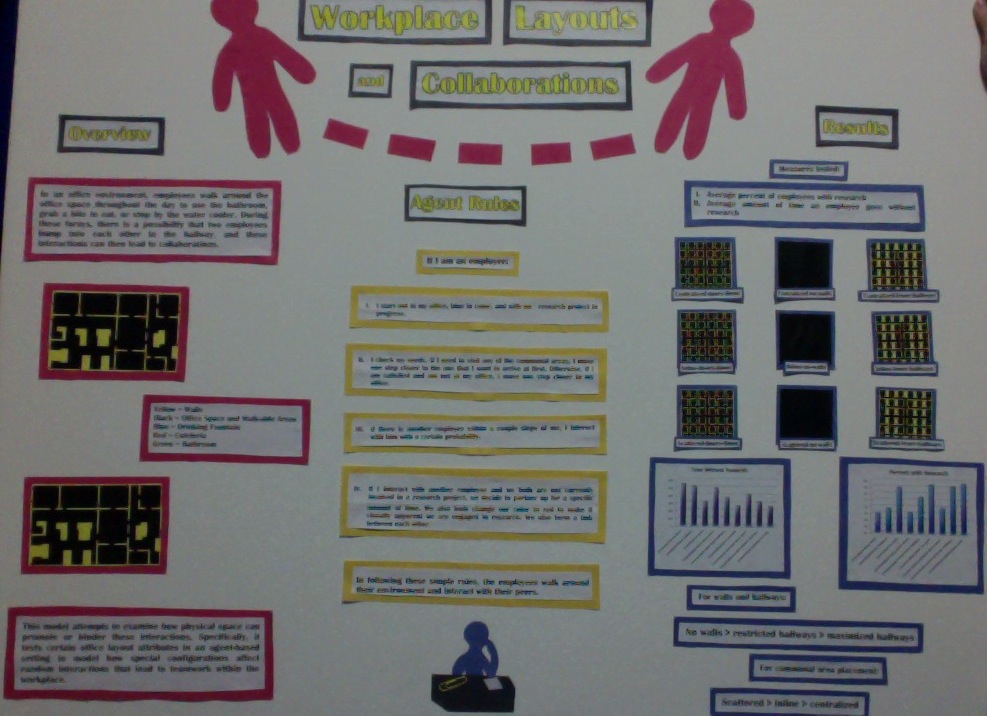 Notice that, in general, the more centralized the communal areas are, the lower the percentage of people with research and the longer the average employee has to wait between research projects. That is, more scattered destinations lead to better results. Playing around with the preset buttons used for analysis (the nine rightmost buttons) can give a good idea of how changing small attributes and keeping everything else constant can make big differences. Also notice how the placement of walls changes behavior: if everyone is in a cubicle and surrounded by walls, they will not interact with other employees while sitting in their offices, only when they walk through the hallways.