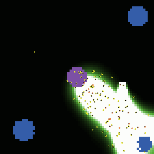 Click the SETUP button to set up the ant nest (in violet, at center) and three piles of food. Click the GO button to start the simulation. The chemical is shown in a green-to-white gradient.