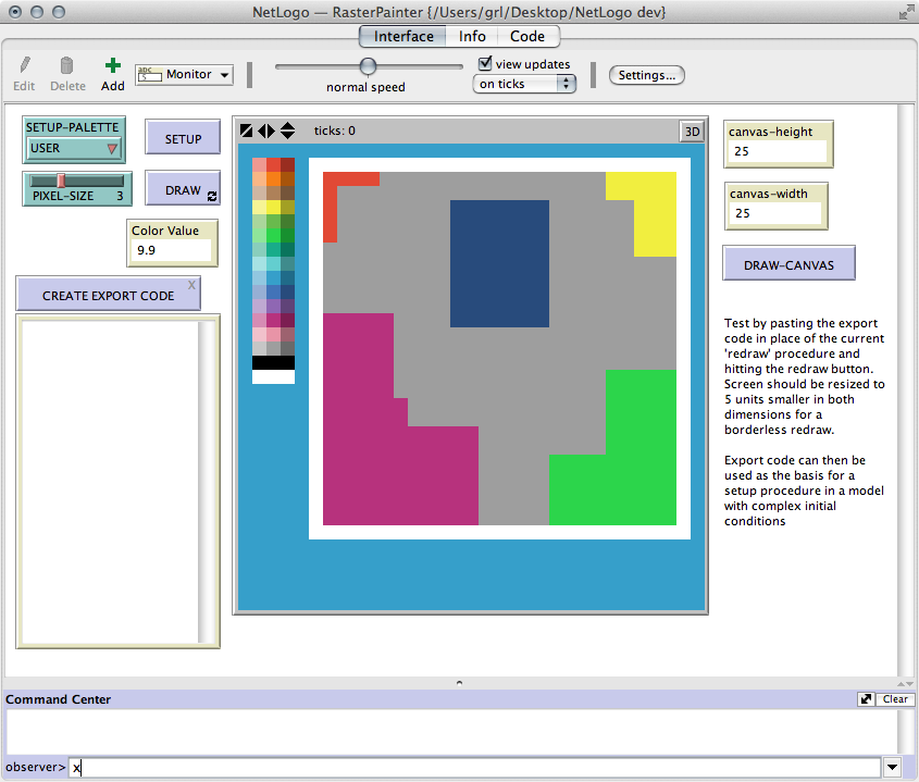 To test the export code, replace the code within this model ( in the area ";;;REPLACE BELOW WITH TEST CODE") with code generated from the export text box. DRAW-CANVAS will redraw the screen with the canvas pattern centered as it would appear if exported into another code.