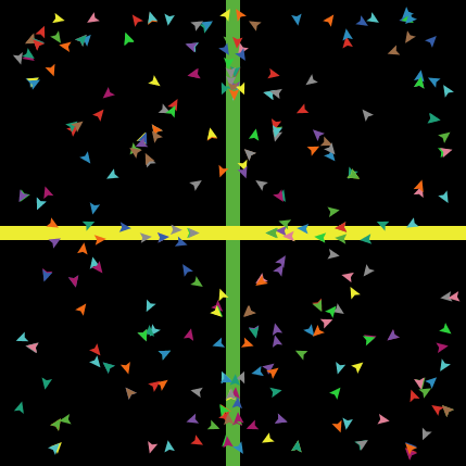 to iniciar clear-all crt 100 ask turtles [ fd 5] ask patches [ if pxcor = 0 [set pcolor green] if pycor = 0 [set pcolor yellow] ] end to rebotar fd paso if pcolor = green [ set heading ( -1 * heading) ] fd 0.01 if pcolor = yellow [ set heading ( 180 - heading) ] end