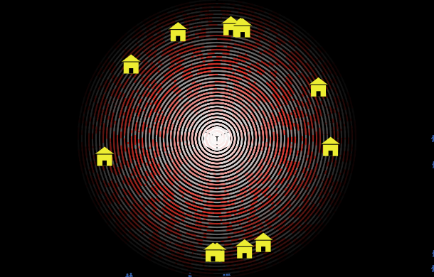 In this model, a plane flies above an observer. Yellow circles represent the peaks of sound waves emitted by the plane.