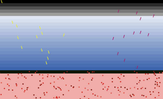 Sometimes the red dots transform themselves into infrared (IR) light that heads toward space, carrying off energy. The probability of a red dot becoming IR light depends on the earth's temperature. When the earth is cold, few red dots generate IR light; when it is hot, most do. The IR energy is represented by a magenta arrowhead. Each carries the same energy as a yellow arrowhead and as a red dot. The IR light goes through clouds but can bounce off CO2 molecules.