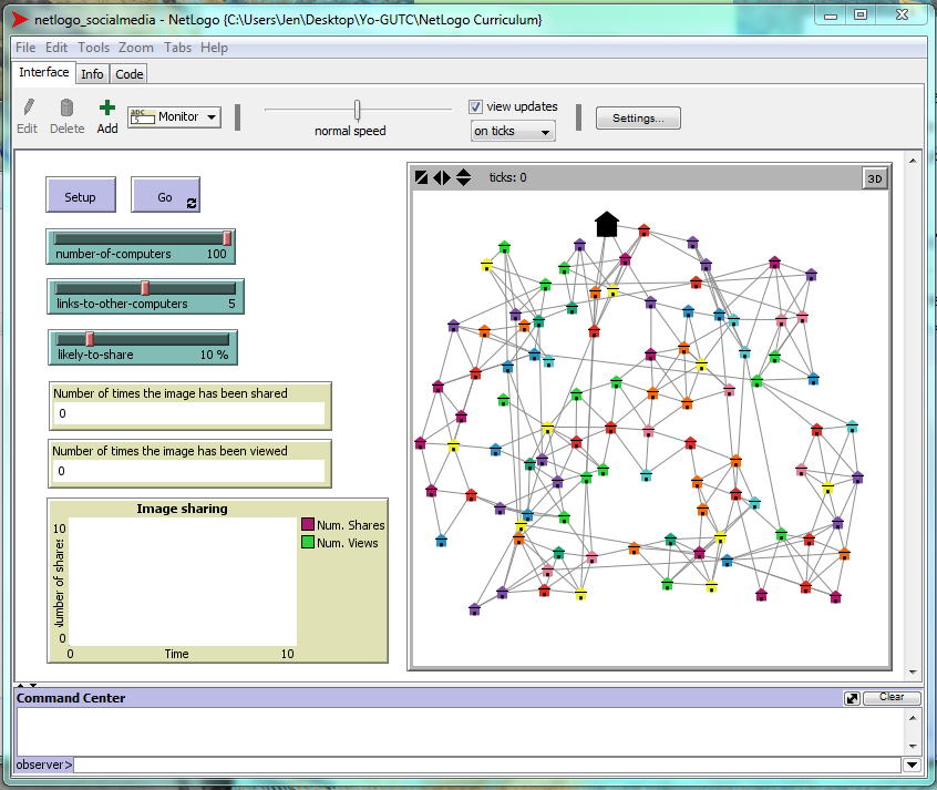 Try increasing/decreasing the number of links between computers. Does the image spread faster or slower? How do you know? Does the number of links affect the number of shares and/or views?