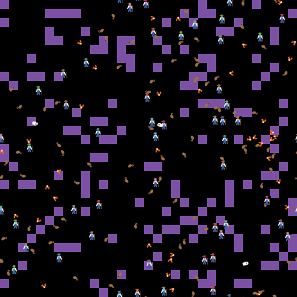 breed [grouse a-grouse] breed [foxes fox] breed [hunters hunter] breed [dgrouse a-dgrouse] grouse-own [energy] foxes-own [energy] dgrouse-own [ghost] to setup clear-all setup-patches reset-ticks setup-turtles set-default-shape grouse "grouse" set-default-shape dgrouse "dgrouse" set-default-shape foxes "fox" set-default-shape hunters "person farmer" end to go ask grouse [ move-grouse eat-grass check-death-grouse reproduce-grouse ] ask foxes [ move-foxes set energy energy + random-float fox-energy check-death-foxes catch-grouse-fox reproduce-foxes ] ask hunters [ move-hunters catch-grouse-hunter catch-foxes ] ask dgrouse [set ghost ghost + 1 check-moveon] regrow-grass tick end to move-grouse ask grouse [ right random 360 forward 1 set energy energy - 1 ] end to move-foxes ask foxes [ right random 360 forward 1 set energy energy - 1 ] end to move-hunters ask hunters [ right random 360 forward 1 ] end to setup-patches ask patches [ set pcolor violet] end to setup-turtles create-grouse number-grouse create-foxes number-foxes create-hunters number-hunters ask grouse [ setxy random-xcor random-ycor set energy energy + random-float 100] ask foxes [ setxy random-xcor random-ycor set energy energy + random-float 100] ask hunters [ setxy random-xcor random-ycor] end to eat-grass ask grouse [ if pcolor = violet [ set pcolor black set energy energy + Heather-nutrients] ] end to reproduce-grouse ask grouse [ if energy > 50 [ set energy energy - 50 hatch 1 [set energy 50] ] ] end to reproduce-foxes ask foxes [ if energy > 50 [ set energy energy - 50 hatch 1 [ set energy 50] ] ] end to catch-grouse-fox let prey one-of grouse-here if prey != nobody [ask prey [ die]] set energy energy + grouse-nutrients end to catch-grouse-hunter let prey one-of grouse-here if prey != nobody [ask prey [set breed dgrouse]] end to catch-foxes let prey one-of grouse-here if prey != nobody [ask prey [ die]] end to check-death-grouse ask grouse [ if energy <= 0 [die]] end to check-death-foxes ask foxes [ if energy <= 0 [ die ]] end to regrow-grass ask patches [ if random 100 < grass-rate [ set pcolor violet] ] end to check-moveon ask dgrouse [ if ghost = 2 [die]] end ;try to have moniter count grouse die by hunter ; set fox energy random ; remove energy from hunters