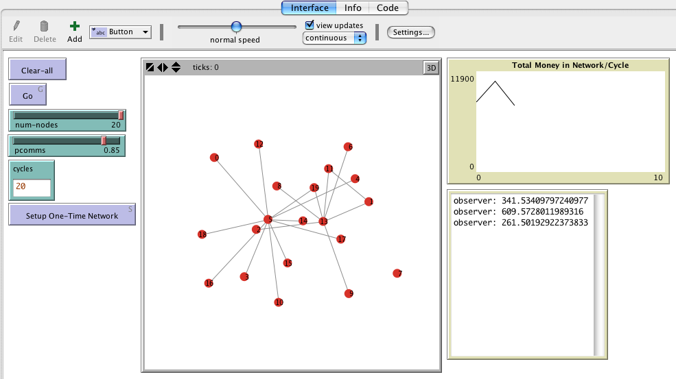 In the interface tab, set the number of agents in the network. Currently the slider limits the agents to 20, but this is arbitrary and can be changed. Set pcomms global to set the probability of connections within the network. Set the number of cycles, or times the bargaining process occurs. Press 'Go.'