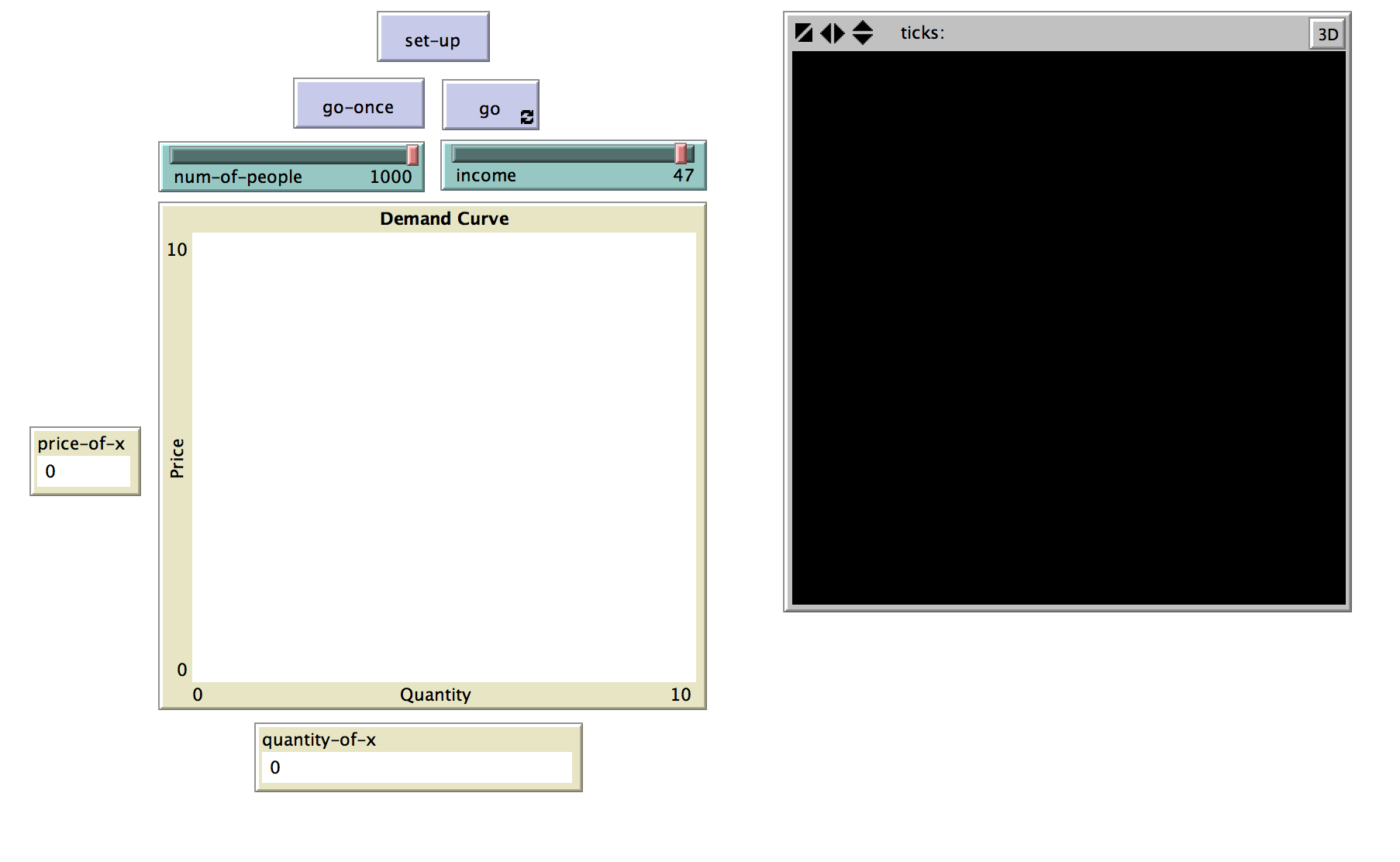 The world represents the cartesian plane where each point is a possible consumption bundle of good x (x axis) or good y (y axis). The coordinates of each agent are its consumption bundle. Assuming all agents have the same income, the agent's budget possibilities for a given level of income is represented by patches in white. The price of good y is set to one. Initially the price of x is set to one and is increased by 0.5 each time step. Agents randomly choose a consumption bundle each time the budget set is updated to reflect the increase in the price of x. Income can be changed from each time step to each time step. The total quantity of x consumed by all agents and the price are plotted to obtain the market demand.