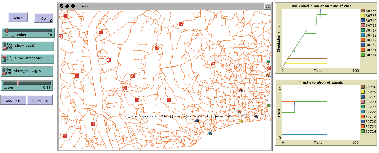 ;%%%%%%%%%%%%%%%%%%%%%%%%%%%%%%%%%%%%%%%%%%%%%%%%%%%%%%%%%%%%%%%%%%%%%%%%%%%%%% ;%%%%%%%%%%%%%%%%%%%%%%%%% Experimention for SCARS %%%%%%%%%%%%%%%%%%%%%%%%%%%% ;%%%%%%%%%%%%%%%%%%%%%%%%%%%%%%%%%%%%%%%%%%%%%%%%%%%%%%%%%%%%%%%%%%%%%%%%%%%%%% ;%%%%% SCARS == SPATIO-TEMPORAL COGNITIVE AGENT-BASED RECOMMENDER SYSTEM %%%%%% __includes [ "communication.nls" ;; Library for ACL exchanging messages "bdi.nls" ;; Library for Beliefs-desire-intention architecture "UserAgent.nls" ;; Cars BDI behavior ] extensions [gis array table] globals [ autobleue_data ;; GIS dataset about electric recharge points in Nice streets_data ;; GIS dataset about streets in Nice Ville nice_buildings ;; GIS dataset about touristic POI in Nice Ville center-x ;; center of the map center-y ;; center of the map mean-wait-time number random-accident-place counter ] breed [cars car] breed [workPlaces workPlace] breed [vertices vertice] cars-own [ speed ;; speed (optional in this demo) myposition ;; my actual position last-stop ;; last item in my path destination ;; a destination where to go mypath ;; a list of vertices to go to a destination step-in-path ;; steps in the path destination-entrance beliefs ;; information about their environment desires ;; state of affairs that an agent want to accomplish intentions ;; plan that allow an agent to achive its goals goals ;; list of possible desires that an agent want to achieve trust ;; the confidence degree distrust ;; the non-confidence degree incoming-queue;; exchanged messages with others agents wait-time ;; time waiting in traffic congestion time-of-simulation ] patches-own[road? distance-work distance-home centroid? id entrance] vertices-own [ myneighbors ;;agentset of neighboring vertices entrance? ;;if it is an entrance to a building test ;;used to delete in test ;;the follwoing variables are used and renewed in each path-selection dist ;;distance from original point to here doone ;;1 if has calculated the shortest path through this point, 0 otherwise lastnode ;;last node to this point in shortest path ] ;%%%%%%%%%%%%%%%%%%%%%%%%%%%%%%Setup%%%%%%%%%%%%%%%%%%%%%%%%%%%%%%%% to setup ca reset-ticks load-data make-streets ;; setup-destinations add-agents set number 15 end to load-data ask patches [set pcolor white] set streets_data gis:load-dataset "paca/gis.osm_roads_free_1.shp";;;route sur Nice Ville set autobleue_data gis:load-dataset "Nice_shapefile/autobleue/autobleue.SHP";; Cartographie de point de recharge des autobleue sur Nice et environs ; set nice_buildings gis:load-dataset "Nice_shapefile/POI/export_musees_galeries_RGF93L93_shapefile.shp" draw end to draw setup-world-envelope gis:set-drawing-color white gis:draw streets_data 1 gis:set-drawing-color blue foreach gis:feature-list-of autobleue_data [ gis:draw ? 1] ;gis:set-drawing-color black gis:draw nice_buildings 1 ;gis:set-drawing-color 25 gis:draw gmu-walkway 1.0 ;identify centroids and assign IDs to centroids foreach gis:feature-list-of autobleue_data[ let center-point gis:location-of gis:centroid-of ? if not empty? center-point [ ask patch item 0 center-point item 1 center-point [ set centroid? true set id gis:property-value ? "IDENT" ] ]] end to setup-world-envelope gis:set-world-envelope gis:envelope-of autobleue_data let world gis:world-envelope let x0 (item 0 world + item 1 world) / 2 + center-x; center let y0 (item 2 world + item 3 world) / 2 + center-y let W0 zoom * (item 1 world - item 0 world) / 2 ; half-widths let H0 zoom * (item 3 world - item 2 world) / 2 set world (list (x0 - W0) (x0 + W0) (y0 - H0) (y0 + H0)) gis:set-world-envelope world end to center while [not mouse-down?] [wait .01] set center-x center-x + (mouse-xcor * gis-patch-size) set center-y center-y + (mouse-ycor * gis-patch-size) draw end to-report gis-patch-size ;; note: assume width & height same let world gis:world-envelope report (item 1 world - item 0 world) / (max-pxcor - min-pxcor) end to zoom-in set zoom max list .01 precision (zoom - .1) 2 draw end to zoom-out set zoom min list 1.2 precision (zoom + .1) 2 draw end to make-streets foreach gis:feature-list-of streets_data[ foreach gis:vertex-lists-of ? ; for the road feature, get the list of vertices [ let previous-node-pt nobody foreach ? ; for each vertex in road segment feature [ let location gis:location-of ? if not empty? location [ ;ifelse any? vertices with [(xcor = item 0 location and ycor = item 1 location) ] ; if there is not a road-vertex here already ;[] ;[ create-vertices 1 [set myneighbors n-of 0 turtles ;;empty set xcor item 0 location set ycor item 1 location ask patch xcor ycor [set road? true] set size 0.2 set shape "circle" set color brown set hidden? true ;; create link to previous node ifelse previous-node-pt = nobody [] ; first vertex in feature [create-link-with previous-node-pt] ; create link to previous node set previous-node-pt self] ;] ]]] ] ;;delete duplicate vertices (there may be more than one vertice on the same patch due to reducing size of the map). therefore, this map is simplified from the original map. delete-duplicates ;;delete some nodes not connected to the network ask vertices [set myneighbors link-neighbors] delete-not-connected ask vertices [set myneighbors link-neighbors] ;;find nearest node to become entrance ask patches with [centroid? = true][set entrance min-one-of vertices in-radius 5 [distance myself] ask entrance [set entrance? true]] ; if show_nodes? [ask vertices [set hidden? false]] ; if show_entrances? [ask entrance [set hidden? false set shape "star" set size 0.5]]] ask links [set thickness 0.1 set color orange] end to delete-duplicates ask vertices [ if count vertices-here > 1[ ask other vertices-here [ ask myself [create-links-with other [link-neighbors] of myself] die] ] ] end to delete-not-connected ask vertices [set test 0] ask one-of vertices [set test 1] repeat 500 [ ask vertices with [test = 1] [ask myneighbors [set test 1]]] ask vertices with [test = 0][die] end to add-agents create-cars cars_number[ set shape "car" set d
