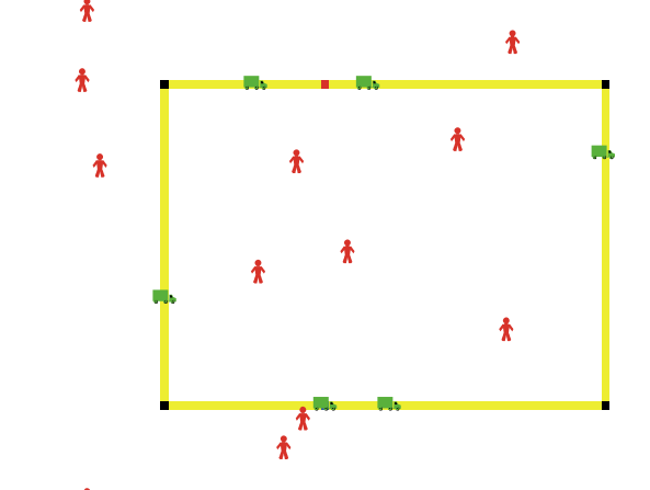 ;; Indice de funciones ; setup - Inicializa ; create-path - Crea la ruta ; create-workers - Crea las personas ; create-AGVs - Crea los Auto Guided Vehicles ; move-AGVs - Mueve tanto las personas como los vehiculos ; go - realiza todas las tareas que hay que realizar en un ciclo ;; Creamos los subgrupos de turtles: people y trucks breed [ people person ] breed [ trucks truck ] ; Los trucks tendran como propiedades las tres siguientes, que seran de cada truck, aunque sean iguales trucks-own [ time-load time-unload velocity ] ; Idem con las personas people-own [ velocity ] ; Indicamos que variables seran globales. No hay que indicar las de los sliders de la otra pestaña, aunque tambien lo son. ; Las variables globales no hay que inicializarlas con el comando 'let' globals [ cycletime lasttick delivery-rate ncycles ] ;; Funcion setup to setup clear-all ; Borramos reset-ticks ; Reiniciamos ticks ask patches [set pcolor white ] ; Ponemos el fondo de color blanco create-path ; Llamamos a las siguientes tres funciones create-workers create-AGVs set lasttick 0 ; lasttick sera una variable que indica en que segundo termino el ultimo ciclo end to create-path let xbor [-20 35] ; x min , xmax let ybor [-20 20] ; y min , ymax let x0 mean xbor ; x media let y0 mean ybor ; y media let xl (max xbor - min xbor ) / 2 ; semirango de x let yl (max ybor - min ybor ) / 2 ; semirango de y ask patches ; Para cada punto de la pantalla, pintamos las lineas con su color [ if (abs( pxcor - x0 ) < xl and abs( pycor - y0 ) = yl) ; Horizontales [ set pcolor yellow] if (abs( pycor - y0 ) < yl and abs( pxcor - x0 ) = xl) ; Verticales [ set pcolor yellow] if (abs( pycor - y0 ) = yl and abs( pxcor - x0 ) = xl) ; Esquinas [ set pcolor black ] if ((pxcor = 0) and (pycor = -20)) ; Punto de carga [ set pcolor blue ] if ((pxcor = 0) and (pycor = 20)) ; Punto de descarga [ set pcolor red ] ] end to create-AGVs create-trucks 1 [ ; Creamos un camion set color green ; De color verde set heading 90 ; Mirando hacia la derecha setxy 0 -20 ; Colocado en (0 , -20) set shape "truck" ; Con forma de camion set size 3 ; Y de tamaño 3. Ojo con esto, pues parece que el camion choca, pero su tamaño real es 1 set velocity velocidad / 60 ; ; set velocity velocidad / 60 + (( random 10 ) - 5) / 100 ; Esta linea esta comentada porque solo se descomenta para el apartado 5 ] end to create-workers create-people numpeople [ ; Creamos las personas set color red ; Color rojo setxy random 100 random 100 ; Las colocamos aleatoriamente set heading random 360 ; Mirando aleatoriamente set shape "person" ; Con forma de personas set size 3 ; Y de tamaño tres set velocity ((random 100) / 50 + 0.05) ; Ojo con esta linea. Todas las personas deben moverse, pues si alguna al crearse se crea en la ruta y no se mueve, no evoluciona el ciclo ] end to go let n count trucks ; n es una variable local que indica el numero de camiones move-AGVs ; Ejecutamos un movimiento if n != count trucks ; Si n ya no es el numero de camiones, es porque alguno ha muerto (ha terminado un ciclo). Entonces, realizamos lo que sigue [ set cycletime ( ticks - lasttick ) ; Recalculamos el tiempo de ciclo como el tiempo actual menos el tiempo que termino el ciclo anterior set lasttick ticks ; Asignamos el nuevo tiempo a lasttick set ncycles ncycles + 1 ; Aumentamos en 1 el numero de ciclos realizados ; set delivery-rate ( cycletime ^ -1 * 60 ) ; Esta forma de calcular el delivery rate seria la instantanea set delivery-rate ncycles / ticks * 60 ; Esta forma de calcular el delivery rate seria la media acumulada ;; A continuacion, pintamos las graficas ; set-current-plot selecciona la figura en la que queremos pintar. Es equivalente a figure(i) ; set-plot-y-range selecciona el rango de y, va de 0 a aproximadamente dos veces el delivery-rate, redondeado para que no este continuamente fluctuando ; plotxt pinta lo que le digas. Primer argumento x, segundo y set-current-plot "Average-Delivery-Rate" set-plot-y-range 0 ceiling ( delivery-rate / 50 ) * 100 plotxy ncycles ( delivery-rate * 60 ) ; Mostramos por la grafica, en paquetes / hora set-current-plot "Instant-Delivery-Rate" set-plot-y-range 0 ceiling ( delivery-rate / 50 ) * 100 plotxy ncycles ( cycletime ^ -1 * 3600 ) ; Mostramos por la grafica, en paquetes / hora if ncycles = 1 ; Si es la primera vez, calculamos el tiempo empleado, que sera el correspondiente a 1 AGV, y mostramos por el terminal de instrucciones. Esta es la respuesta al apartado a, creo [ print (word "Datos: v = " velocidad " m/min ; load-time = " load-time " m unload-time = " unload-time " m" ) print (word "Tiempo de ciclo 1 AGV = " cycletime " s") ] create-AGVs ; Recordemos, estamos en el if, que se entra si hemos matado un camion. Por tanto, creamos otro, que se crea en la posicion de carga. ] if count trucks < nAGVs ; Si todavia no tenemos en pista el numero maximo de camiones ... (esto solo ocurre al principio, en el regimen transitorio. Luego esto no ocurre) [ let free true ; Definimos la variable free y le asignamos el valor true ask trucks[ ; Si algun camion se encuentra sobre una casilla azul, que recordemos, es la casilla de carga if pcolor = blue [ set free false ] ; Entonces no podemos sacar un camion al path, puesto que la casilla esta ocupada. No haremos nada, y volveremos a entrar en el ciclo en el proximo tick ] if free = true [ create-AGVs ] ; Si por el contrario, la casilla de carga esta vacia, generamos un nuevo camion ] tick end to move-AGVs let tl load-time ; trabajamos con variables locales let tu unload-time set tl ( tl * 60 ) ; pasamos de min -> s set tu ( tu * 60 ) ask people [ if-else any? trucks-on patch-ahead 1 [ left 90 ][ left random 20 right random 20] ; Le preguntamos a las personas: ¿Hay un camion delante tuya?, si lo hay, gira 90º a la izquierda, si no, gira ligeramente fd velocity ; En cualquier caso, avanza la velocidad que tengas asiganada ] ask trucks [ ;; Load and unload stations if pcolor = blue ; Si estamos en la zona de carga [ if (t