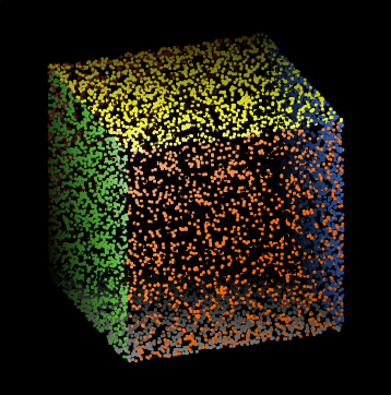 To create the 3D shapes the program randomly generates turtles about the shell of the cube. To render the cube in the NetLogo view, it translates the turtles from spherical to cartesian coordinates using shades to simulate depth. The positions of the turtles are always stored as spherical coordinates because they are rotated on the all of the spherical axes.