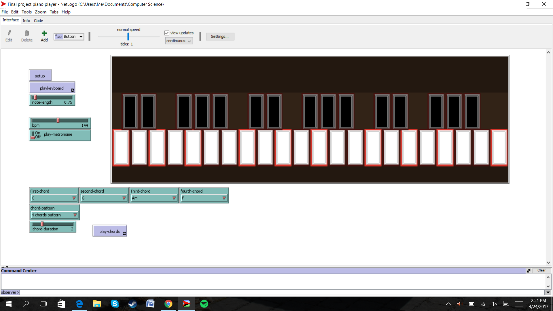 To allow for user-controlled playing, select the note-length you desire and press playkeyboard. The keys are played by clicking over them in the Netlogo world.