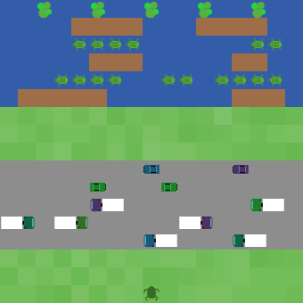 There are two main obstacles to overcome, the road and the river. The road has cars and trucks moving at various speeds that are liable to run over the frog. Once you have crossed the road safely, you must overcome the danger lurking in the river. Unfortunately, you will die if you jump in the river, so you must keep moving towards the lily pads by jumping on the logs or sets of turtles moving back and forth in the river's current.