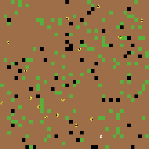 This project explores a simple ecosystem made up of rabbits, grass, and weeds. The rabbits wander around randomly, and the grass and weeds grow randomly. When a rabbit bumps into some grass or weeds, it eats the grass and gains energy. If the rabbit gains enough energy, it reproduces. If it doesn't gain enough energy, it dies.