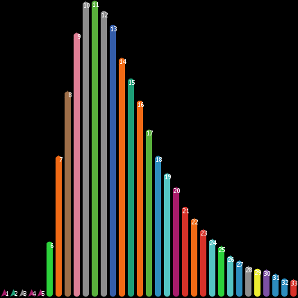 ; How many times you need to throw a dice to obtain the 6 possible face values? ; At least 6 times, of course ; Mean value is 14.7 sharp ; Simulation by Francisco Restivo, frestivo@gmail.com globals [valor faces serie nseries media fim] to setup clear-all crt 33 ; 33 turtles, for lengths from 1 to 33 ask turtles [ set label (who + 1) setxy (who - 16) -16 set heading 0 set pen-size 9 pd ] reset-ticks set faces [0 0 0 0 0 0] set serie 0 set nseries 0 set fim 0 end to throw tick set valor random 6 set serie serie + 1 if item valor faces = 0 [ set faces replace-item valor faces 1 ] if faces = [1 1 1 1 1 1] [ ; got the 6 faces? if serie <= 33 [ ask turtle (serie - 1) [ forward 10 ^ step if ycor >= 16 [ ; race ended? set fim 1] ] ] set faces [0 0 0 0 0 0] set nseries (nseries + 1) set media (ticks / nseries) set serie 0 ] end to go if fim = 0 [ throw ] end