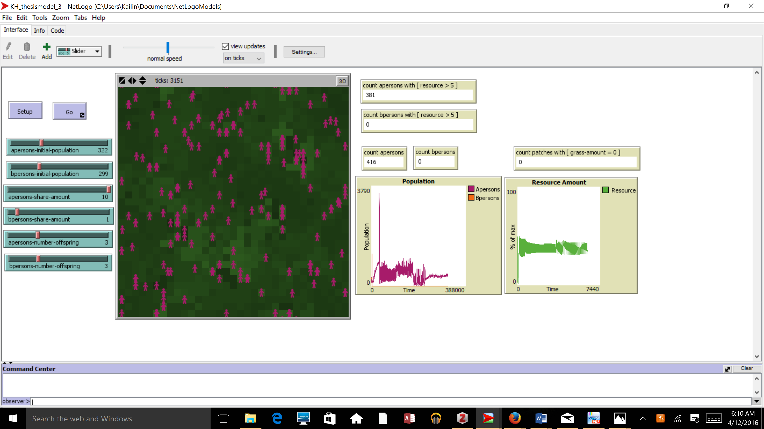 The Socio-Natural model is made up of two breeds of agents who interact with the environment and other agents. The environment is a wrapping world made up of patches with a generic resource that have a determined carrying capacity and growth rate assigned at the start of the simulation. For this model one tick or iteration represents one year. Every model should run for at least one-thousand iterations or until population collapse. Population collapse is defined as no more individuals.