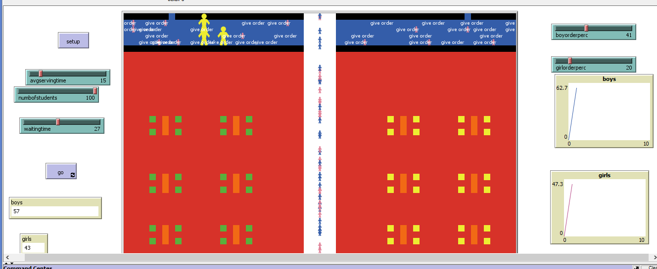 globals [tickCount ] breed [servers server] turtles-own [count-down birth-tick servingtime orderitem ] to setup clear-all setupworld reset-ticks end to setupworld ask patches [ setup-barcounter] ask patches [ setup-path ] ask patches [ setup-tables] ask patches [ setup-chairs] setupserver setup-students end to setupserver set-default-shape servers "person" ;set size 3 ask n-of 3 (patches with [pcolor = blue]) [sprout-servers 1 [set color yellow set size 3 set label "take order"]] end to setup-path if pycor < 25 and pycor > -25 [ set pcolor red ] if pxcor < 3 and pxcor > -3 [ set pcolor white ] end to setup-barcounter if pycor > 25 and pycor < 30 [ set pcolor blue] ask patch -23 30 [ set pcolor blue] ask patch 23 30 [ set pcolor blue] end to setup-tables ask patch 24 14 [ set pcolor orange] ask patch 24 13 [ set pcolor orange] ask patch 24 12 [ set pcolor orange] ask patch 24 5 [ set pcolor orange] ask patch 24 4 [ set pcolor orange] ask patch 24 3 [ set pcolor orange] ask patch 24 -14 [ set pcolor orange] ask patch 24 -13 [ set pcolor orange] ask patch 24 -12 [ set pcolor orange] ask patch 24 -5 [ set pcolor orange] ask patch 24 -4 [ set pcolor orange] ask patch 24 -3 [ set pcolor orange] ask patch 13 14 [ set pcolor orange] ask patch 13 13 [ set pcolor orange] ask patch 13 12 [ set pcolor orange] ask patch 13 5 [ set pcolor orange] ask patch 13 4 [ set pcolor orange] ask patch 13 3 [ set pcolor orange] ask patch 13 -14 [ set pcolor orange] ask patch 13 -13 [ set pcolor orange] ask patch 13 -12 [ set pcolor orange] ask patch 13 -5 [ set pcolor orange] ask patch 13 -4 [ set pcolor orange] ask patch 13 -3 [ set pcolor orange] ask patch -24 14 [ set pcolor orange] ask patch -24 13 [ set pcolor orange] ask patch -24 12 [ set pcolor orange] ask patch -24 5 [ set pcolor orange] ask patch -24 4 [ set pcolor orange] ask patch -24 3 [ set pcolor orange] ask patch -24 -14 [ set pcolor orange] ask patch -24 -13 [ set pcolor orange] ask patch -24 -12 [ set pcolor orange] ask patch -24 -5 [ set pcolor orange] ask patch -24 -4 [ set pcolor orange] ask patch -24 -3 [ set pcolor orange] ask patch -13 14 [ set pcolor orange] ask patch -13 13 [ set pcolor orange] ask patch -13 12 [ set pcolor orange] ask patch -13 5 [ set pcolor orange] ask patch -13 4 [ set pcolor orange] ask patch -13 3 [ set pcolor orange] ask patch -13 -14 [ set pcolor orange] ask patch -13 -13 [ set pcolor orange] ask patch -13 -12 [ set pcolor orange] ask patch -13 -5 [ set pcolor orange] ask patch -13 -4 [ set pcolor orange] ask patch -13 -3 [ set pcolor orange] end to setup-chairs ask patch 26 14 [ set pcolor yellow] ask patch 26 12 [ set pcolor yellow] ask patch 22 14 [ set pcolor yellow] ask patch 22 12 [ set pcolor yellow] ask patch 26 5 [ set pcolor yellow] ask patch 26 3 [ set pcolor yellow] ask patch 22 5 [ set pcolor yellow] ask patch 22 3 [ set pcolor yellow] ask patch 26 -5 [ set pcolor yellow] ask patch 26 -3 [ set pcolor yellow] ask patch 22 -5 [ set pcolor yellow] ask patch 22 -3 [ set pcolor yellow] ask patch 26 -14 [ set pcolor yellow] ask patch 26 -12 [ set pcolor yellow] ask patch 22 -14 [ set pcolor yellow] ask patch 22 -12 [ set pcolor yellow] ask patch 15 14 [ set pcolor yellow] ask patch 15 12 [ set pcolor yellow] ask patch 11 14 [ set pcolor yellow] ask patch 11 12 [ set pcolor yellow] ask patch 15 5 [ set pcolor yellow] ask patch 15 3 [ set pcolor yellow] ask patch 11 5 [ set pcolor yellow] ask patch 11 3 [ set pcolor yellow] ask patch 15 -5 [ set pcolor yellow] ask patch 15 -3 [ set pcolor yellow] ask patch 11 -5 [ set pcolor yellow] ask patch 11 -3 [ set pcolor yellow] ask patch 15 -14 [ set pcolor yellow] ask patch 15 -12 [ set pcolor yellow] ask patch 11 -14 [ set pcolor yellow] ask patch 11 -12 [ set pcolor yellow] ask patch -26 14 [ set pcolor green] ask patch -26 12 [ set pcolor green] ask patch -22 14 [ set pcolor green] ask patch -22 12 [ set pcolor green] ask patch -26 5 [ set pcolor green] ask patch -26 3 [ set pcolor green] ask patch -22 5 [ set pcolor green] ask patch -22 3 [ set pcolor green] ask patch -26 -5 [ set pcolor green] ask patch -26 -3 [ set pcolor green] ask patch -22 -5 [ set pcolor green] ask patch -22 -3 [ set pcolor green] ask patch -26 -14 [ set pcolor green] ask patch -26 -12 [ set pcolor green] ask patch -22 -14 [ set pcolor green] ask patch -22 -12 [ set pcolor green] ask patch -15 14 [ set pcolor green] ask patch -15 12 [ set pcolor green] ask patch -11 14 [ set pcolor green] ask patch -11 12 [ set pcolor green] ask patch -15 5 [ set pcolor green] ask patch -15 3 [ set pcolor green] ask patch -11 5 [ set pcolor green] ask patch -11 3 [ set pcolor green] ask patch -15 -5 [ set pcolor green] ask patch -15 -3 [ set pcolor green] ask patch -11 -5 [ set pcolor green] ask patch -11 -3 [ set pcolor green] ask patch -15 -14 [ set pcolor green] ask patch -15 -12 [ set pcolor green] ask patch -11 -14 [ set pcolor green] ask patch -11 -12 [ set pcolor green] end to setup-students reset-ticks set-default-shape turtles "person" create-turtles numbofstudents [ set color one-of [blue pink] set ycor random-ycor set heading 90 set birth-tick ticks set count-down waitingtime ; set size 2 ] ask n-of ( int (girlorderperc / 100 * count turtles with [color = pink ])) turtles ; n-of (int (0.30 * count turtles)) turtles [ movetocounter ] ask n-of ( int (boyorderperc / 100 * count turtles with [color = blue ])) turtles [ movetocounter ] end to separate-student if any? other turtles-here [ fd 1 separate-student ] end to go ;movetocounter move-turtles ask servers [ rt random 10 fd 1 if orderitem != 0 and pcolor = orange [set pcolor sky set label "placing order on table"] ;if pcolor = sky [set pcolor orange set label " Removing dish from table"] ] ask servers [ rt random 10 fd 1 if orderitem != 0 and pcolor = sky [set pcolor orange set label " Removing dish from table"] ] tick if ticks >= 1200 [stop] end to move-turtles ask turtles with [color = pink ] [ ;let targ one-of patches with[pcolor = blue] ; if